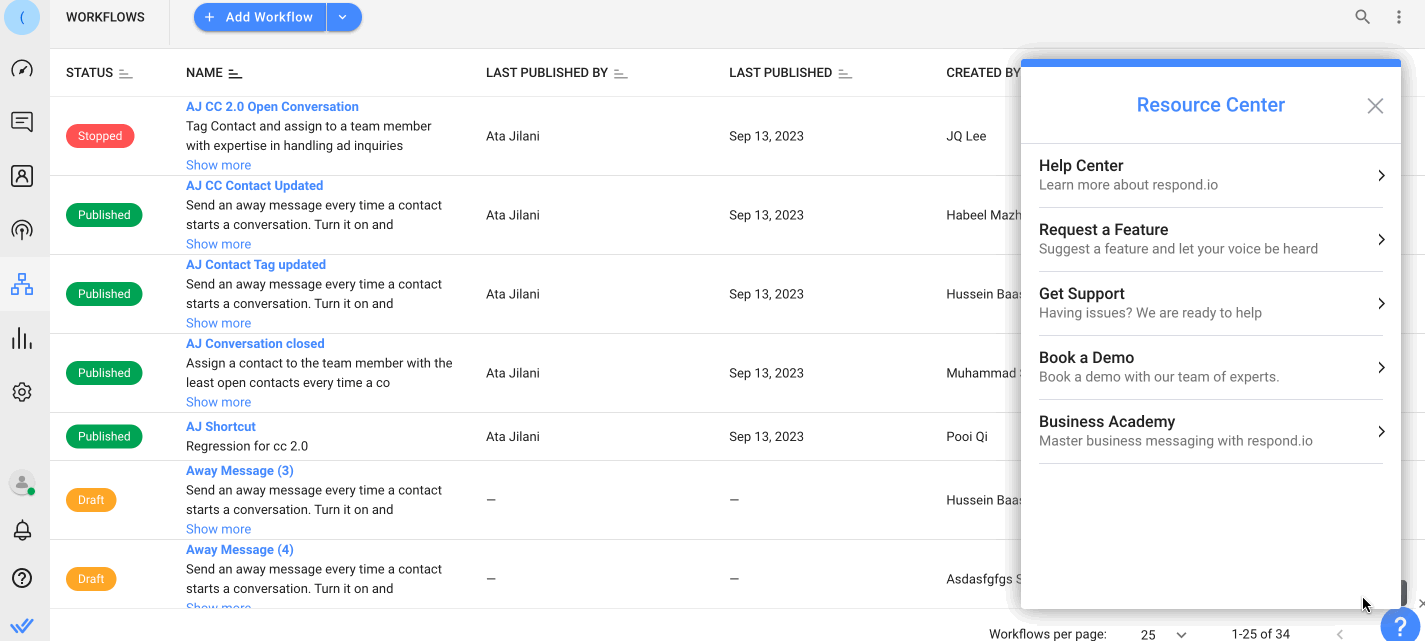 You can click the Resource Center icon from any page on respond.io to access the following resources: