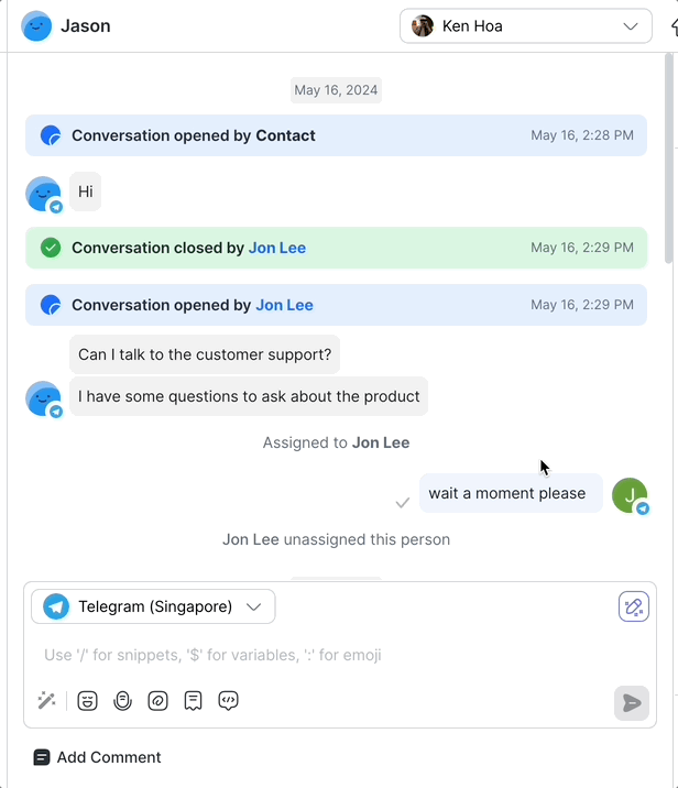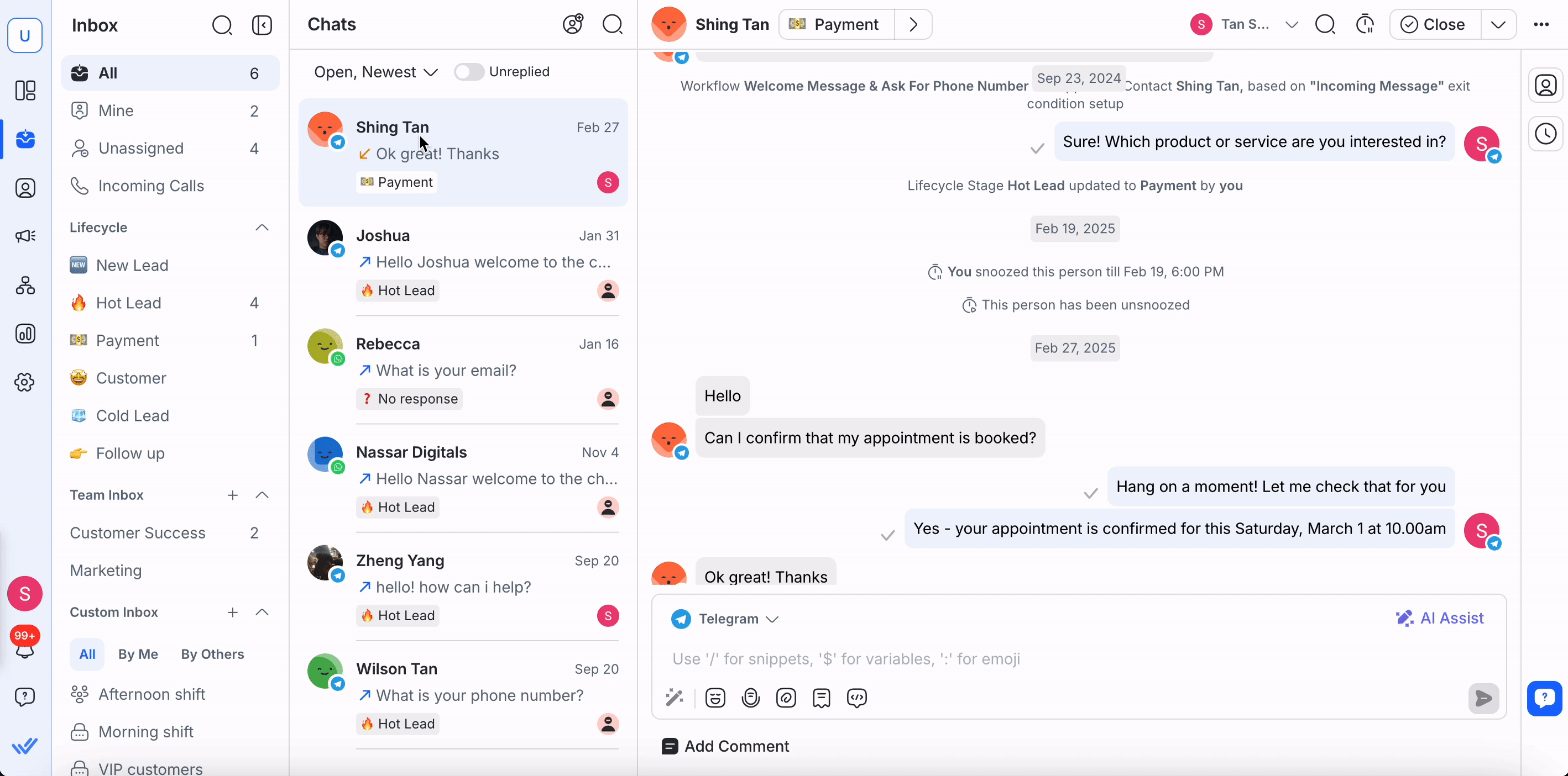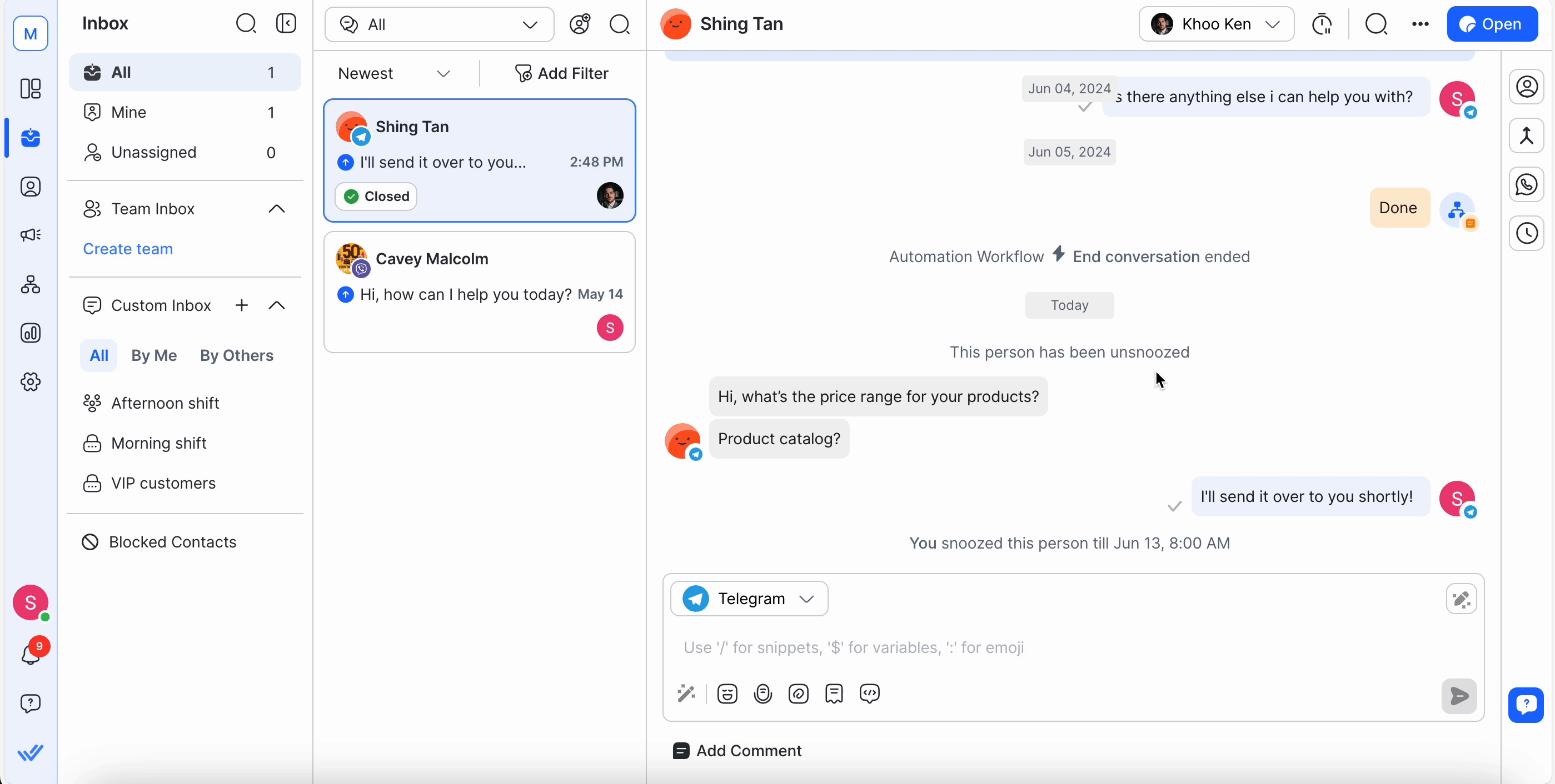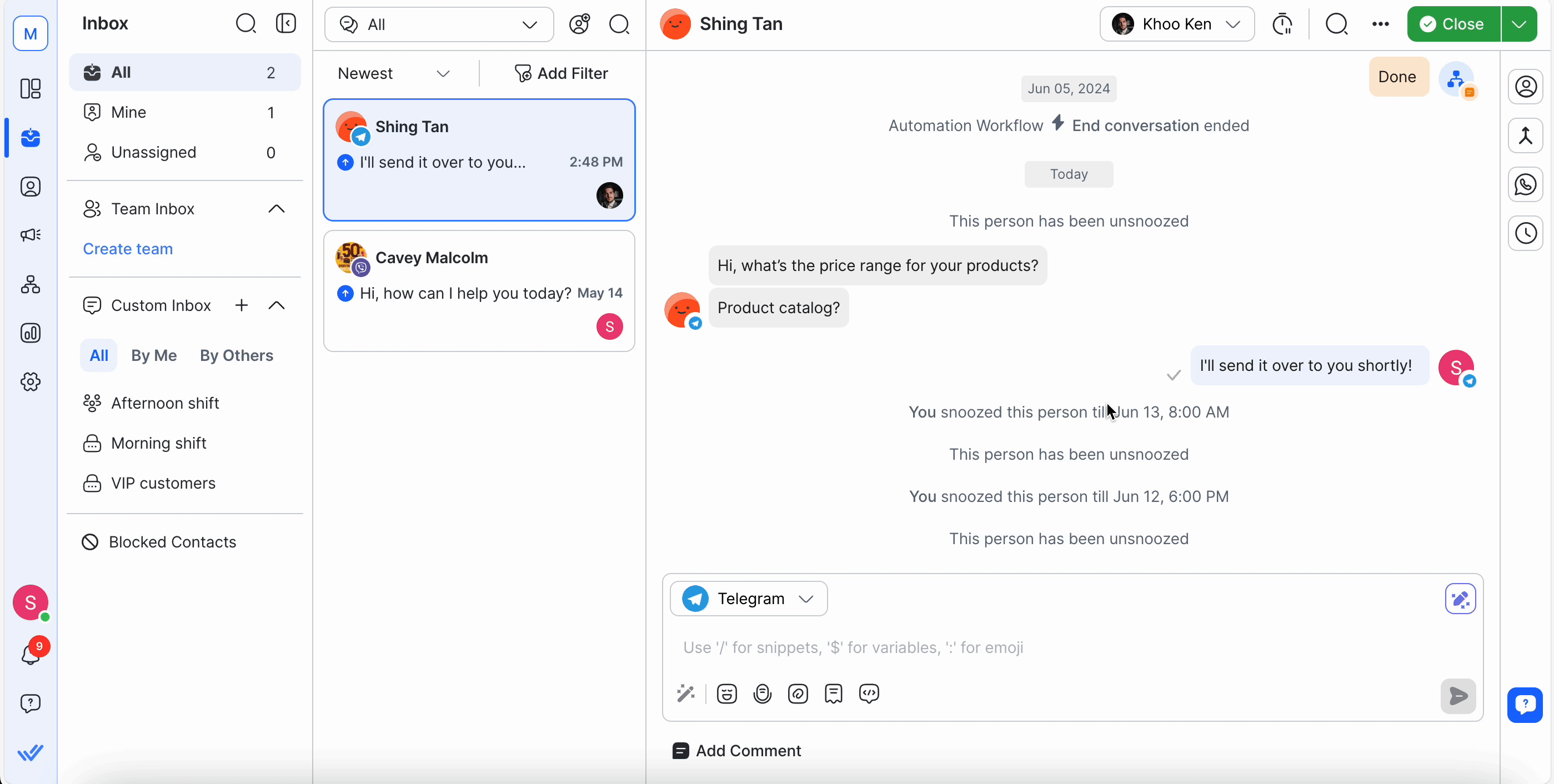 Reminder Line Item: When a Contact is snoozed, a line displays at the top of the messaging console. It disappears once the contact is unsnoozed.