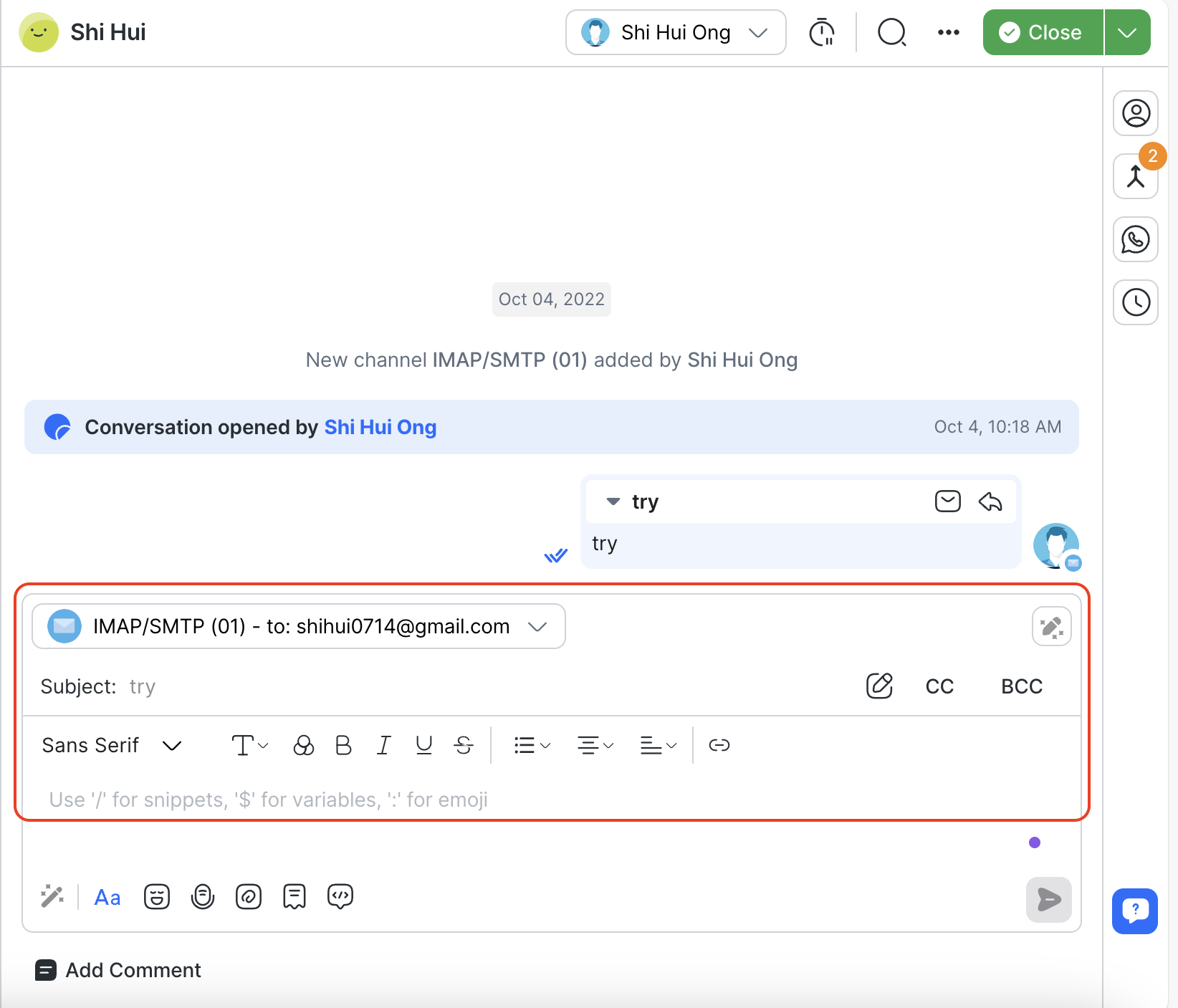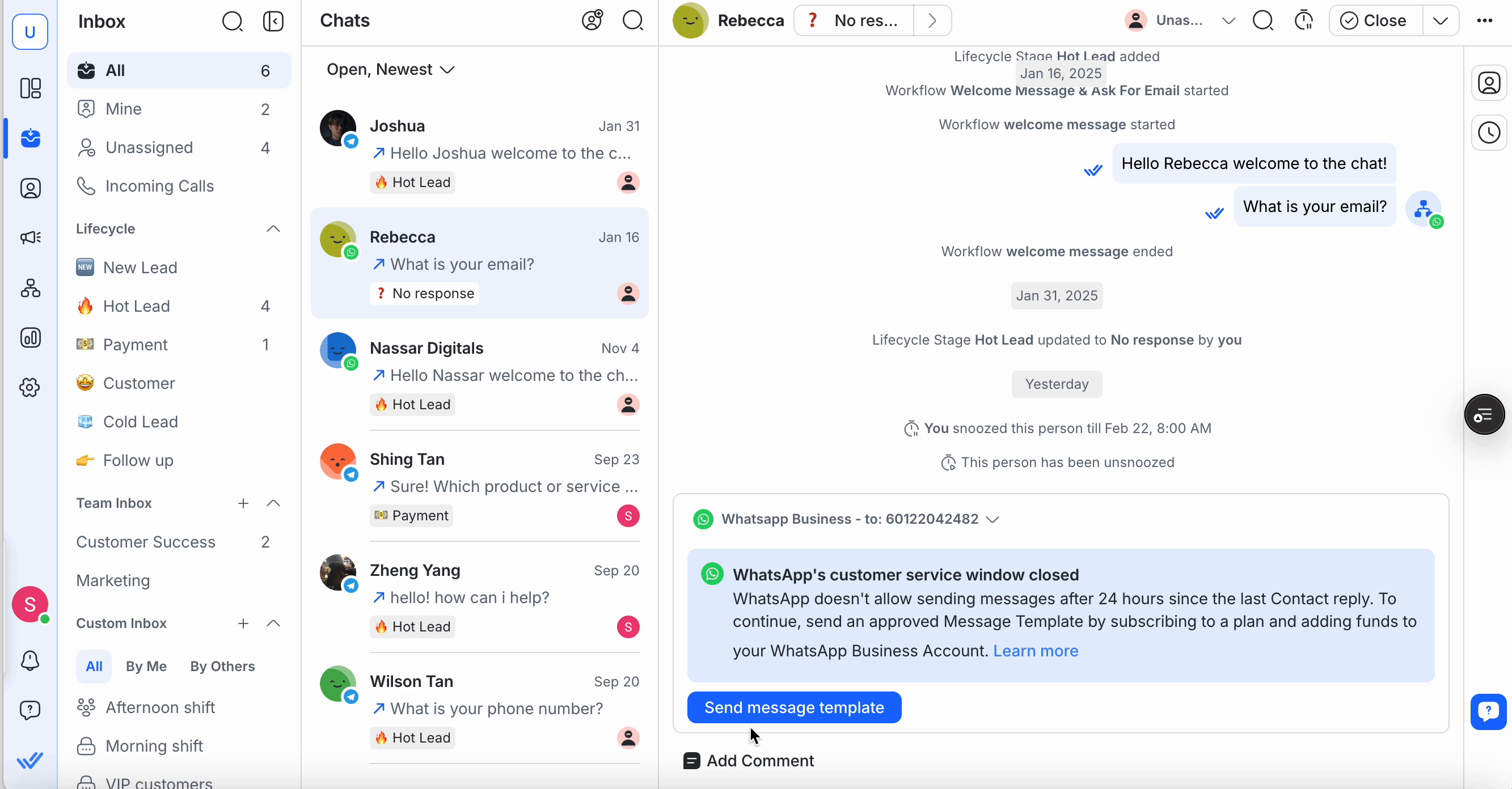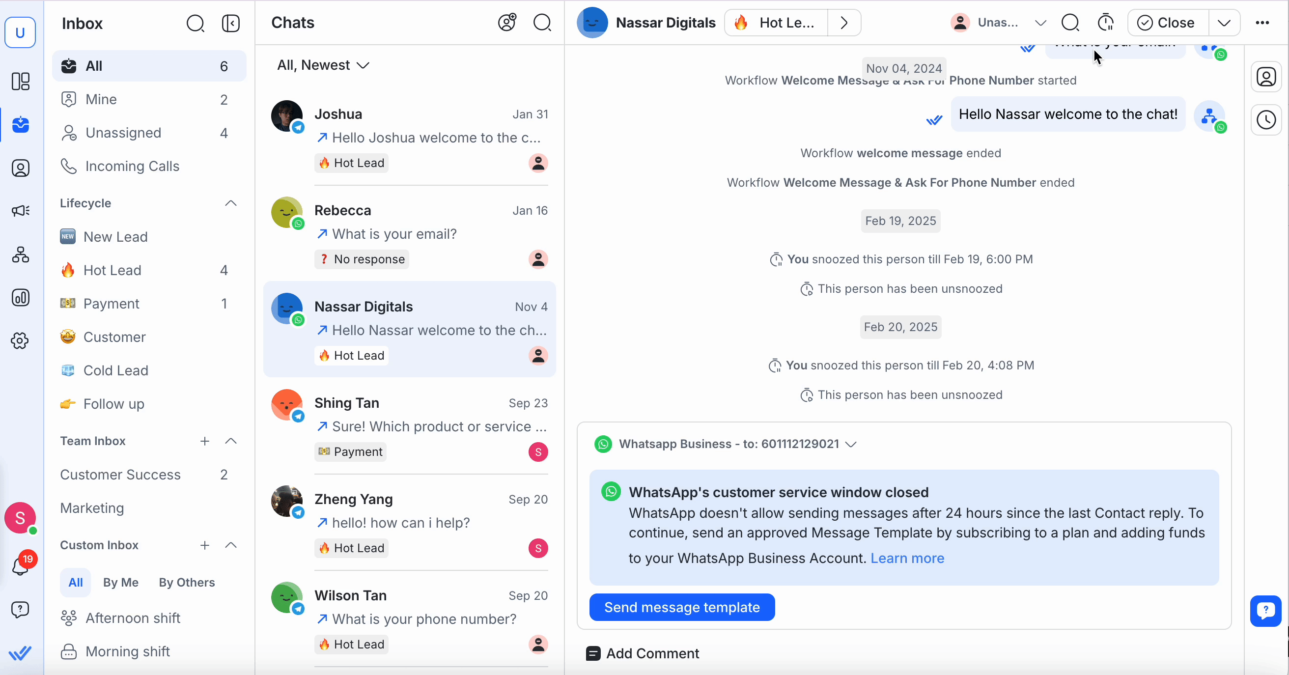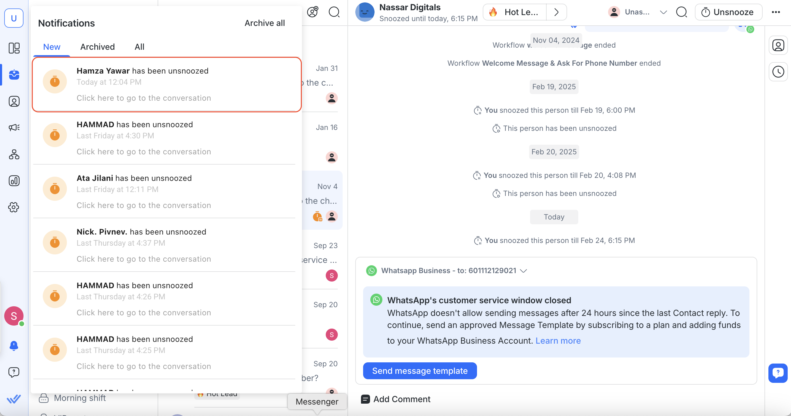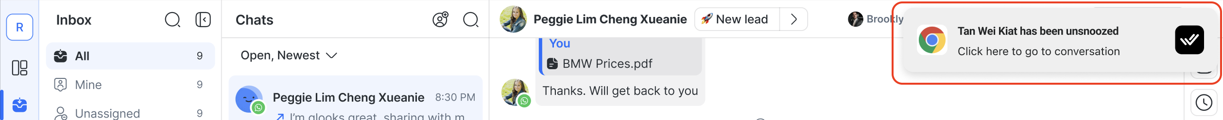 Push Notification: When the Snooze ends, a push notification is sent to the assigned agent(s) according to the workspace notification settings.