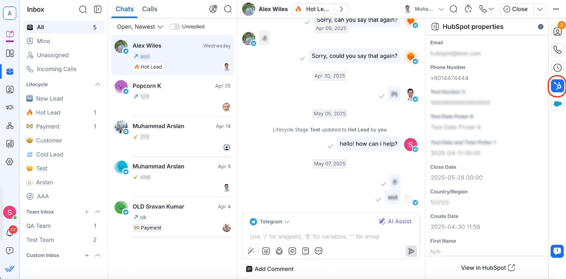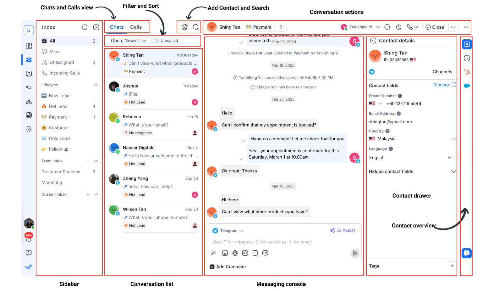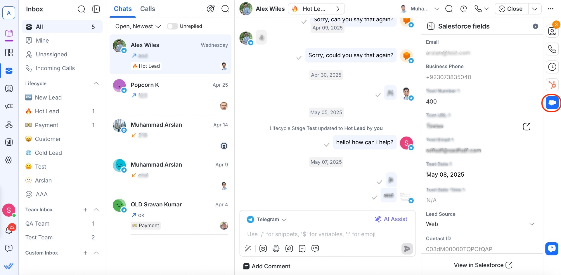 If your Workspace is connected to HubSpot or Salesforce, youâll see CRM information directly in the Contact Drawer. From here, users can view, manage, and edit supported fieldsâstreamlining contact management without leaving the Inbox.