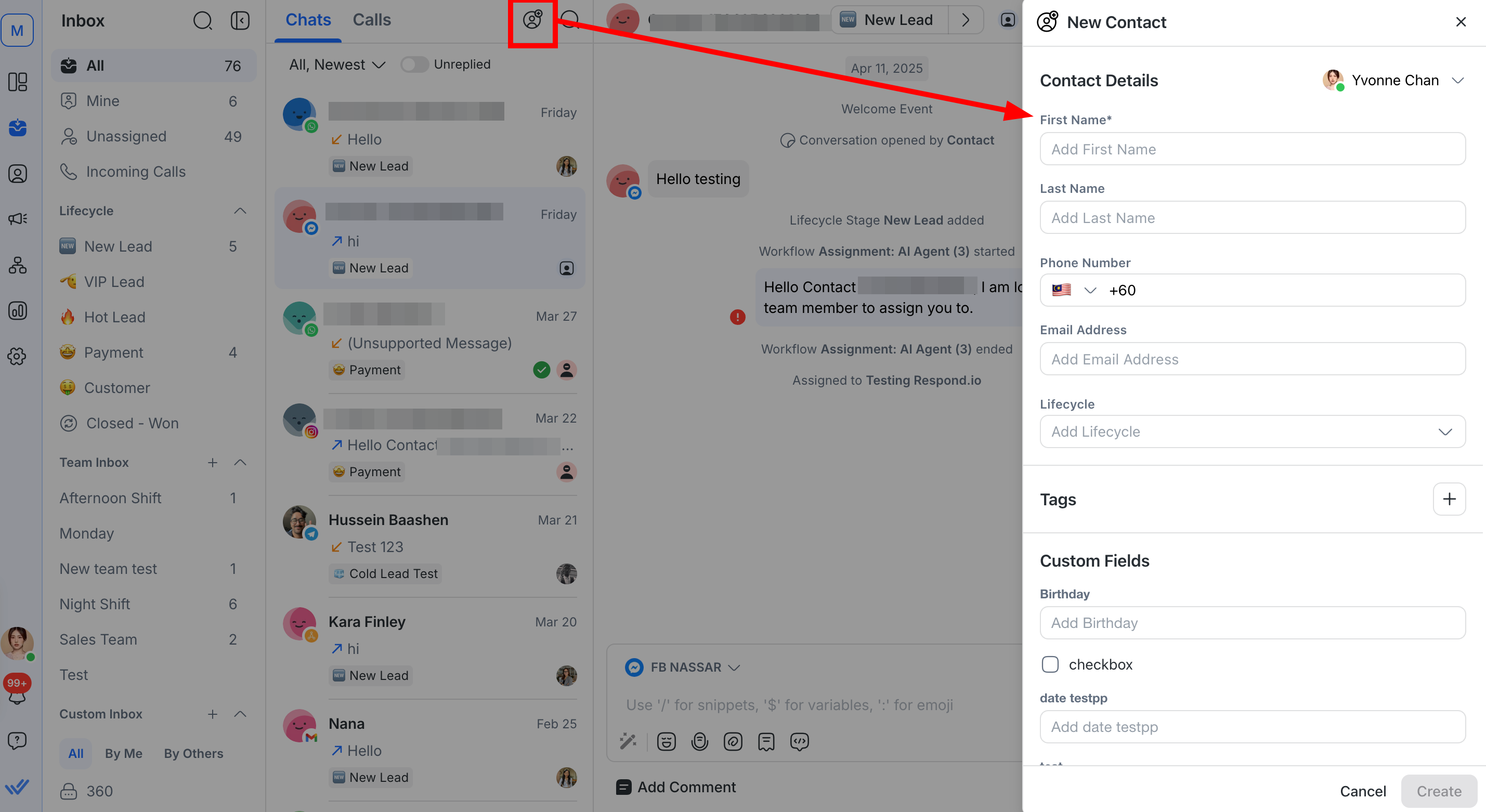 Click the Create new Contact icon to add a new Contact directly from the conversation list.