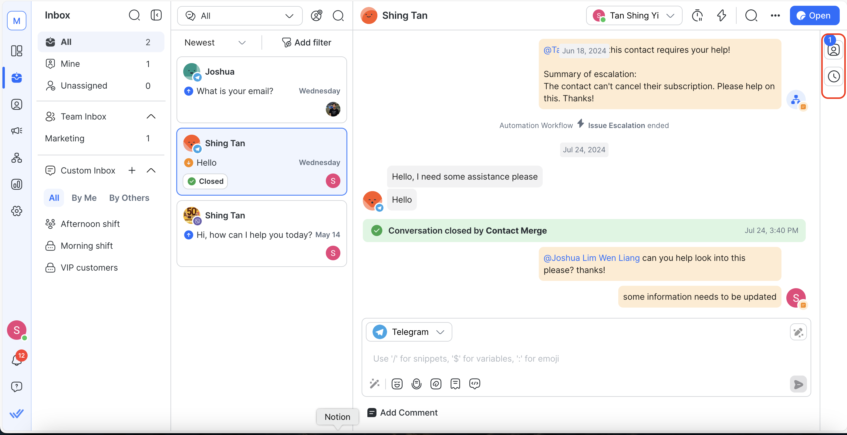 In the rightmost column of the Inbox module, you can access the Contact Drawer of a selected Contact by clicking on any tabs in the vertical sidebar.
