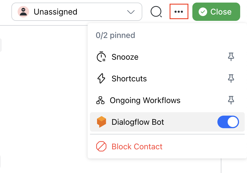 You can turn off the Dialogflow Bot manually from the Inbox module with the Dialogflow Bot toggle at the conversation action bar for each Contact.