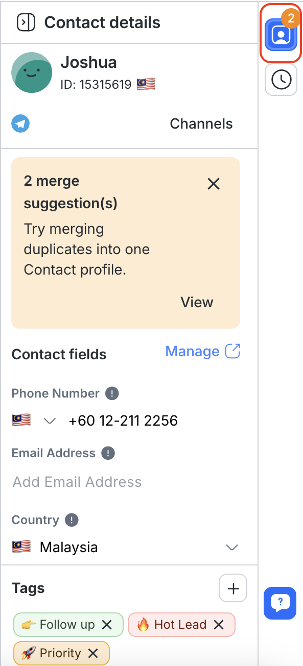 You can also view any merge suggestions if duplicate Contact information is found, along with the list of Channels connected to the Workspace.