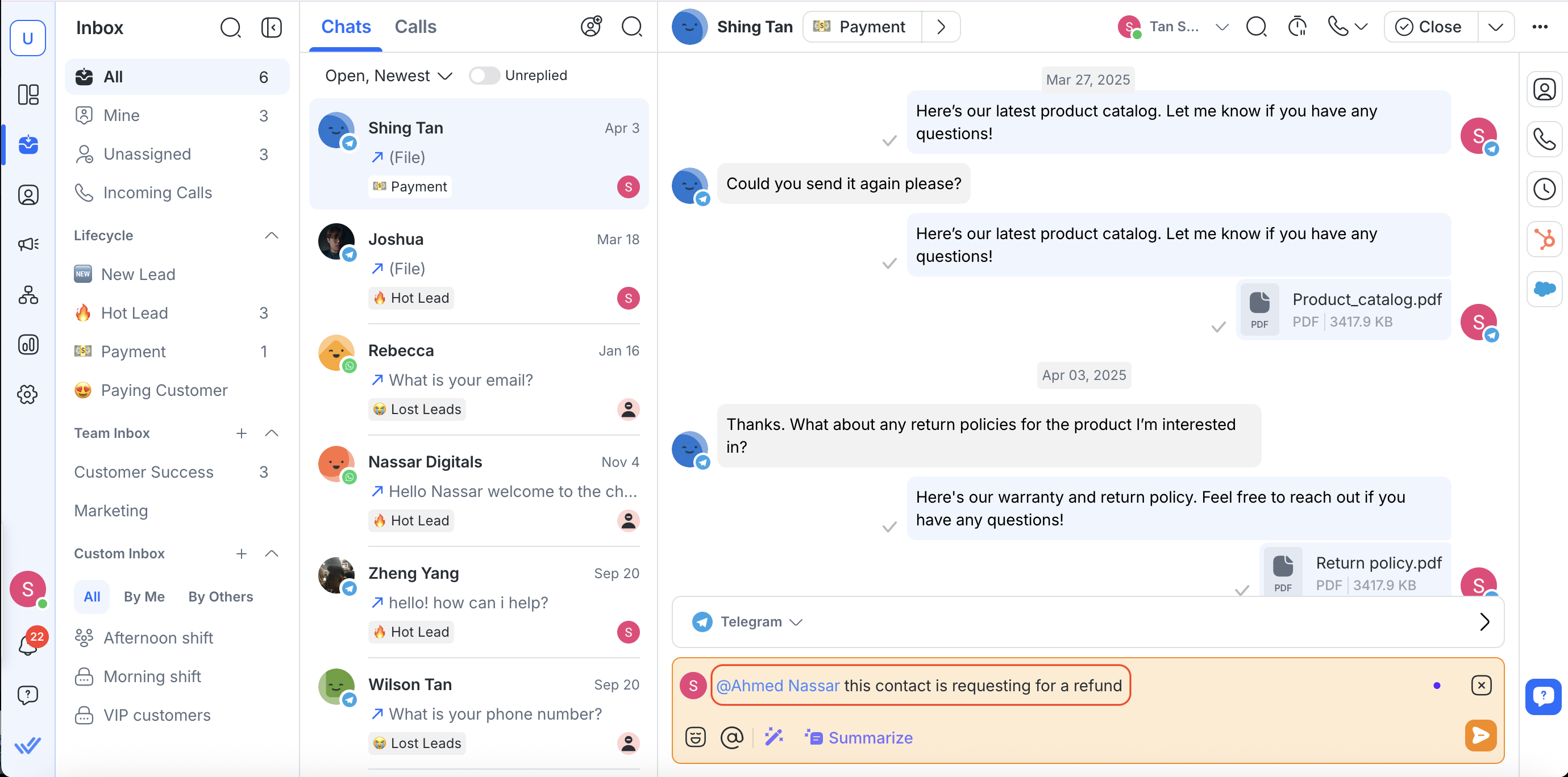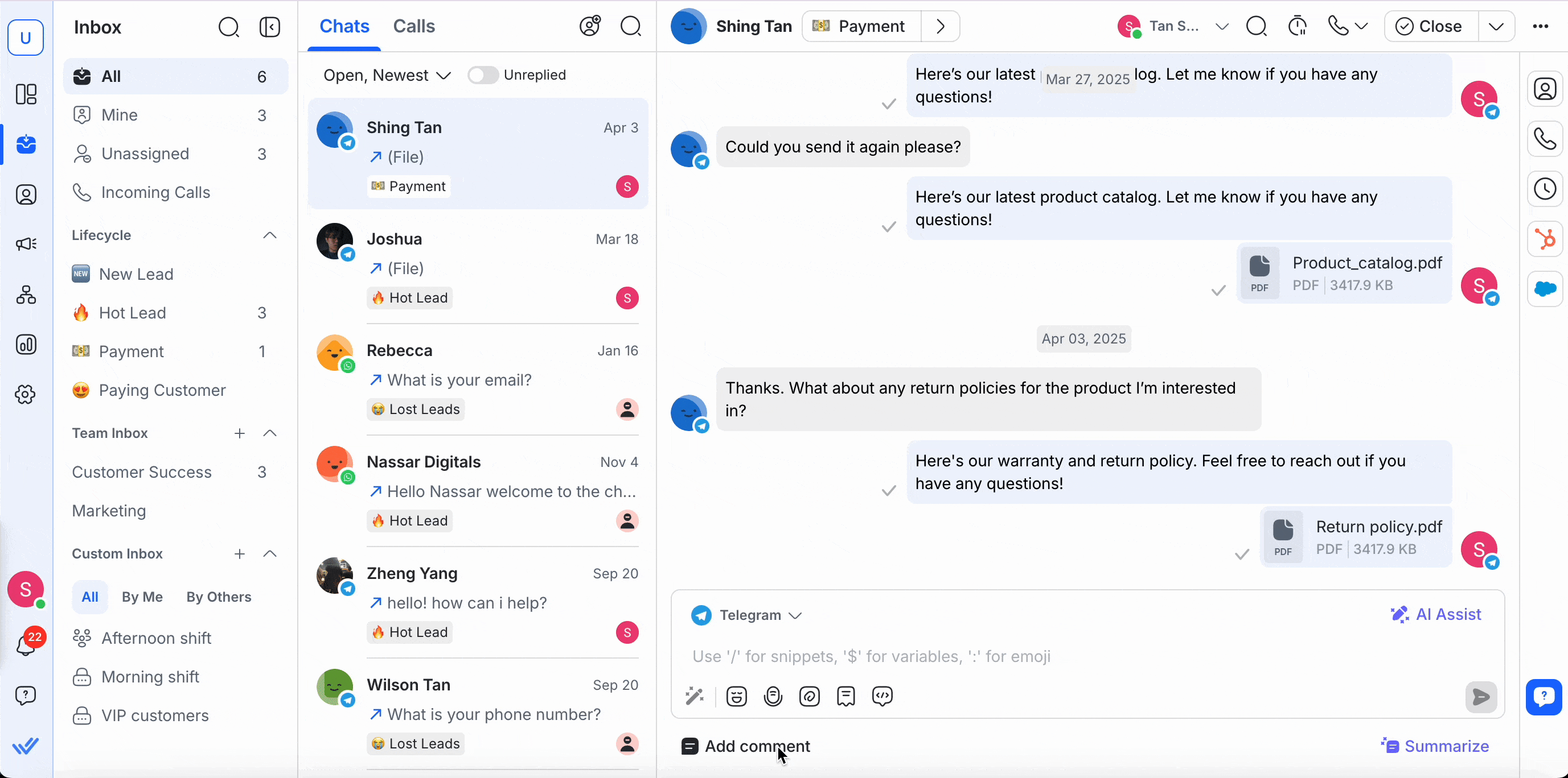 Agents with access to calling features will see an Incoming Calls tab in the Inbox sidebar. This menu helps agents stay organized and respond to calls efficiently, while respecting assigned permissions.