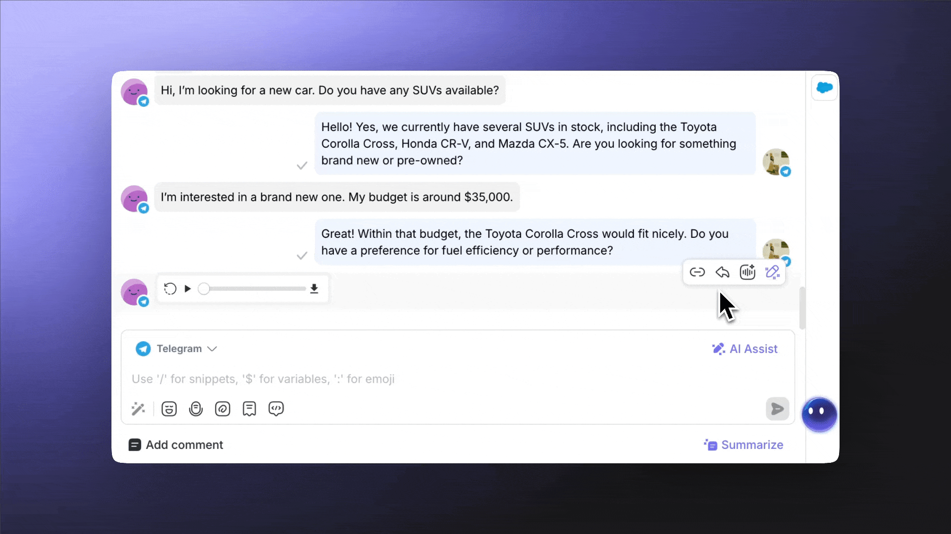 You can select Reply with AI Assist to generate a response to a specific message.