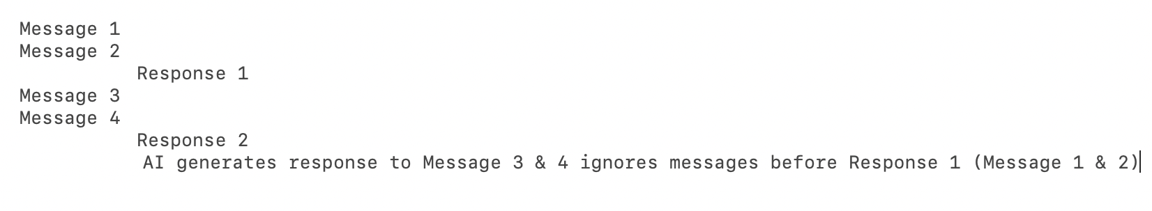 In this example, it is assumed that the AI Assist button was clicked after Response 2 was sent. Even though a response has already been sent, AI Assist still drafts a response to Message 3 and 4. However, it has not drafted a response to Message 1 and 2 due to the presence of Response 1.