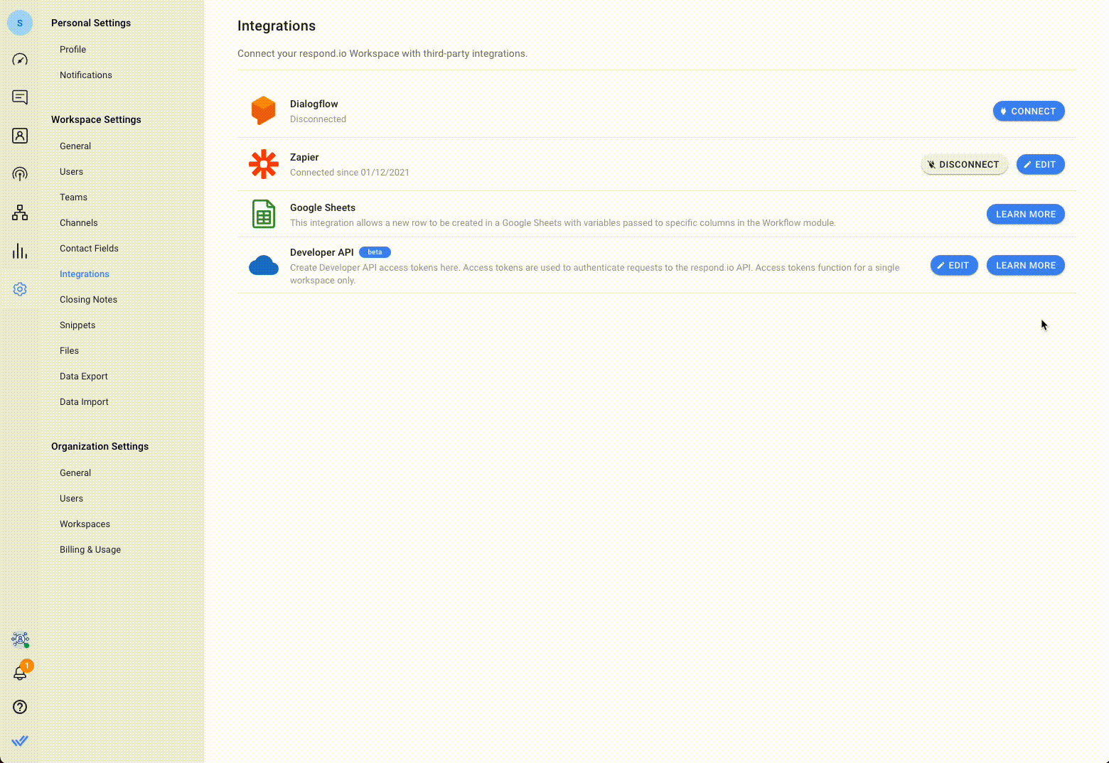Developer APIs empower any developer or team to build custom solutions and integrations. Respond.io’s Developer API allows users to take advantage of many core features in respond.io, including automating messages, syncing CRMs and triggering Workflows.