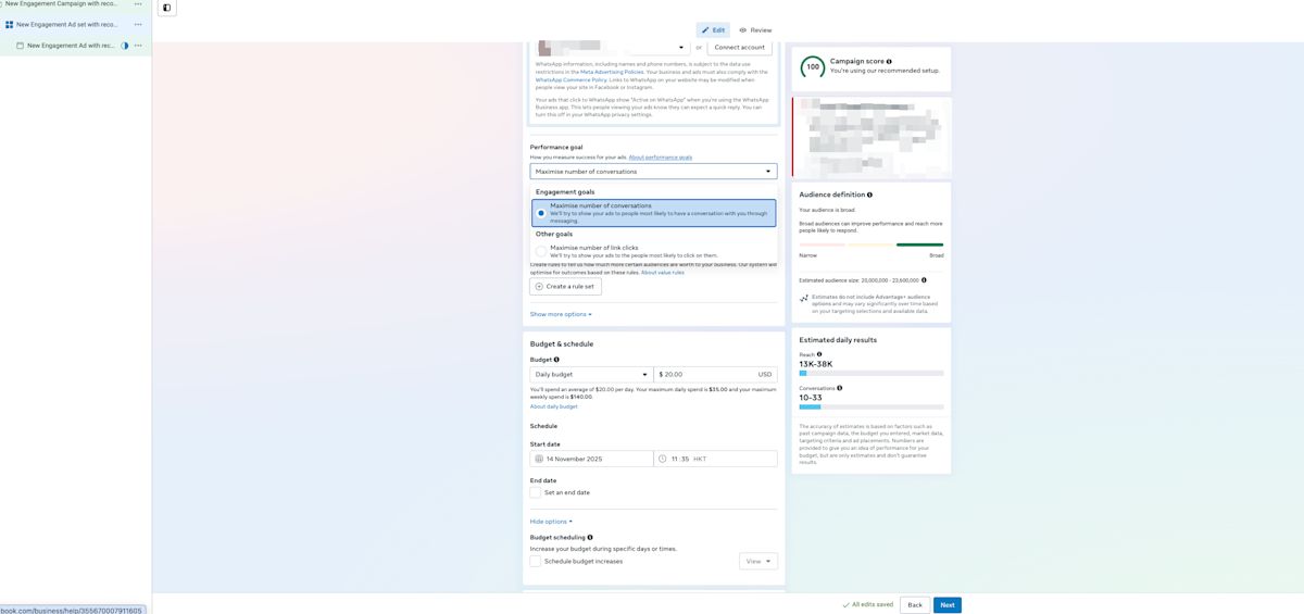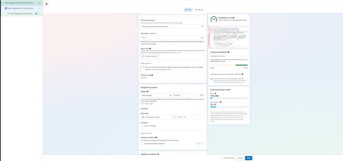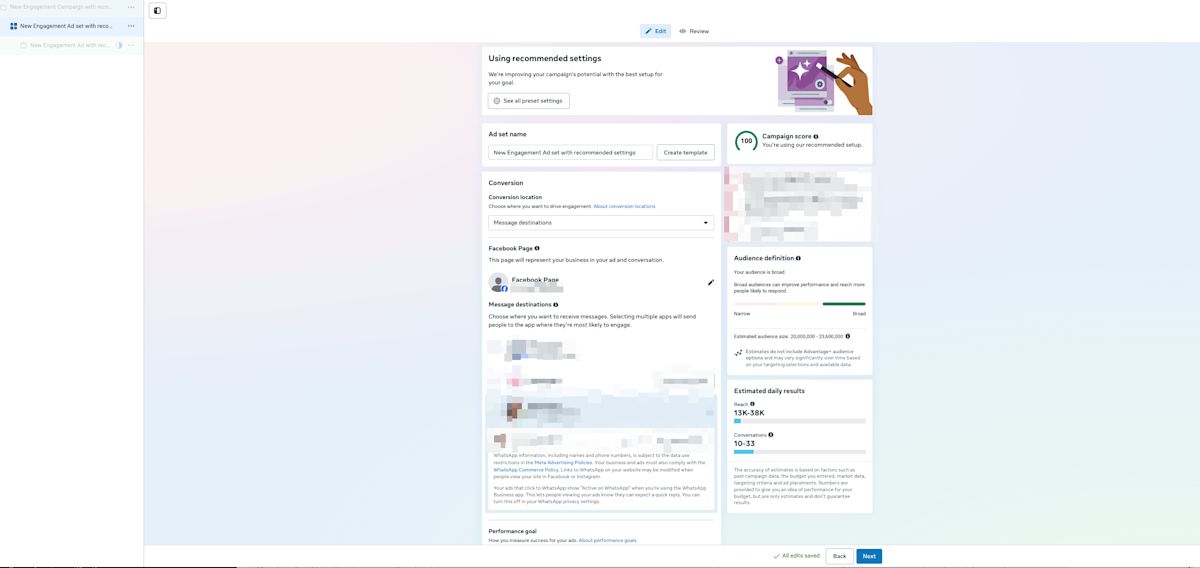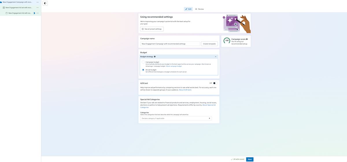 Review your campaign settings, including Budget Settings. You can learn more about campaign budgets here. When ready, click Next to configure your Ad Set.