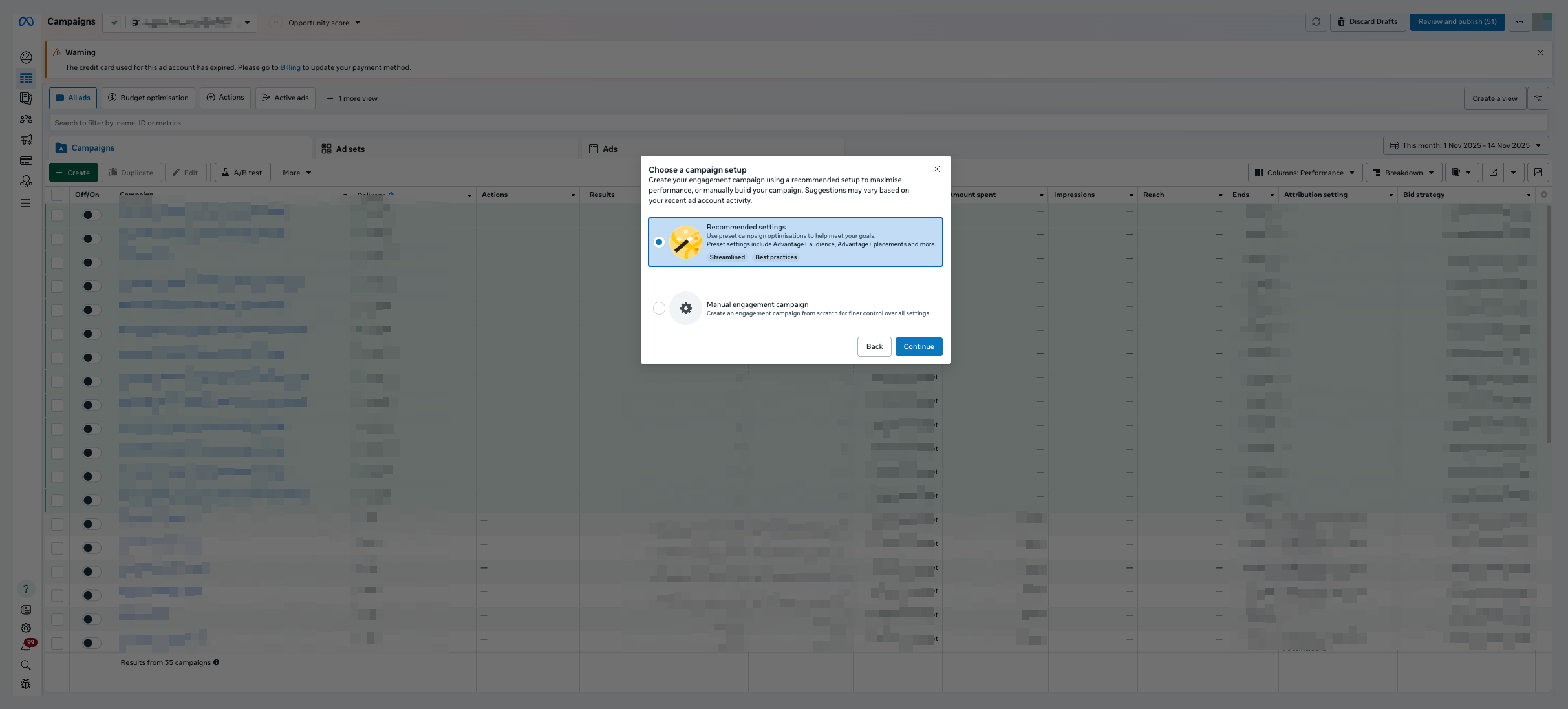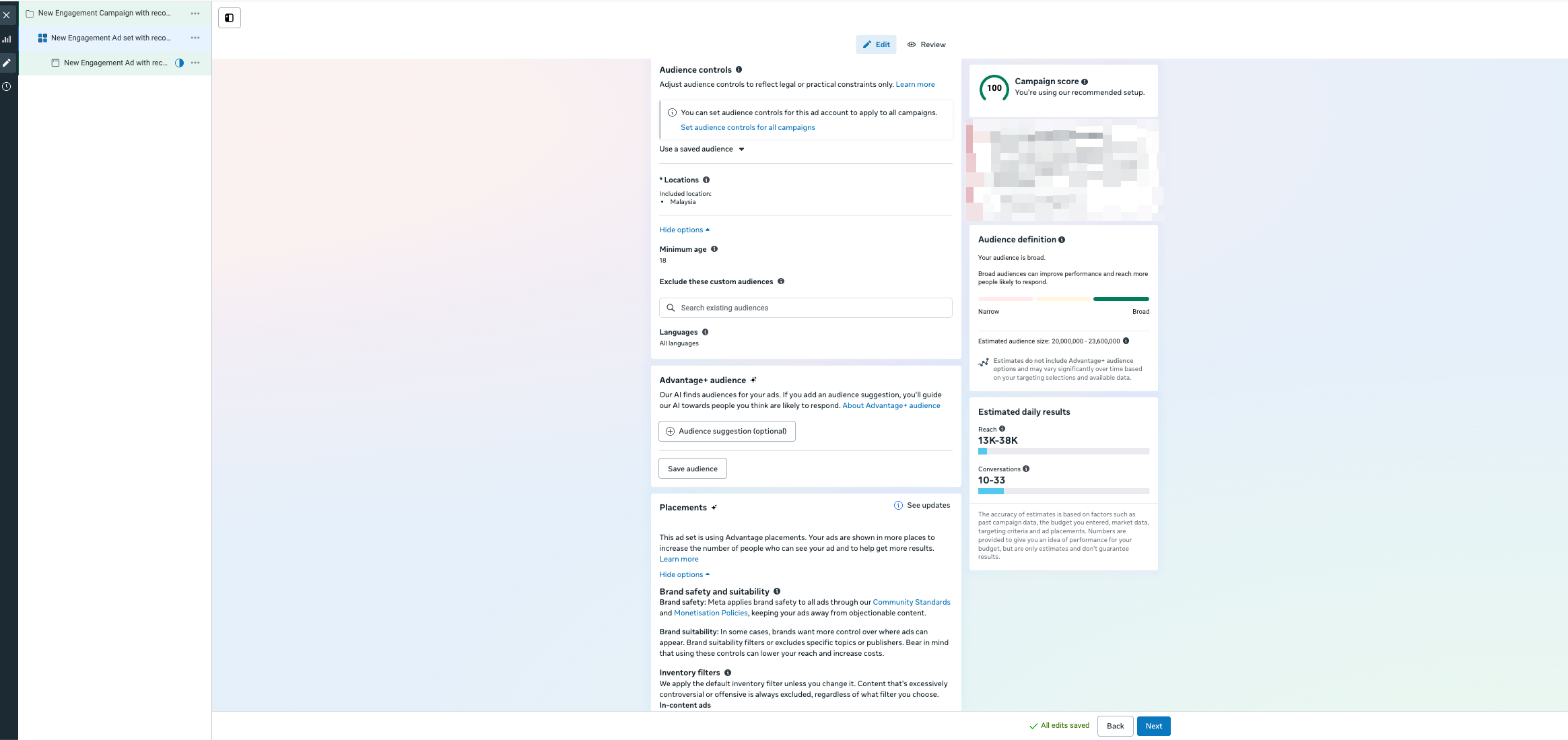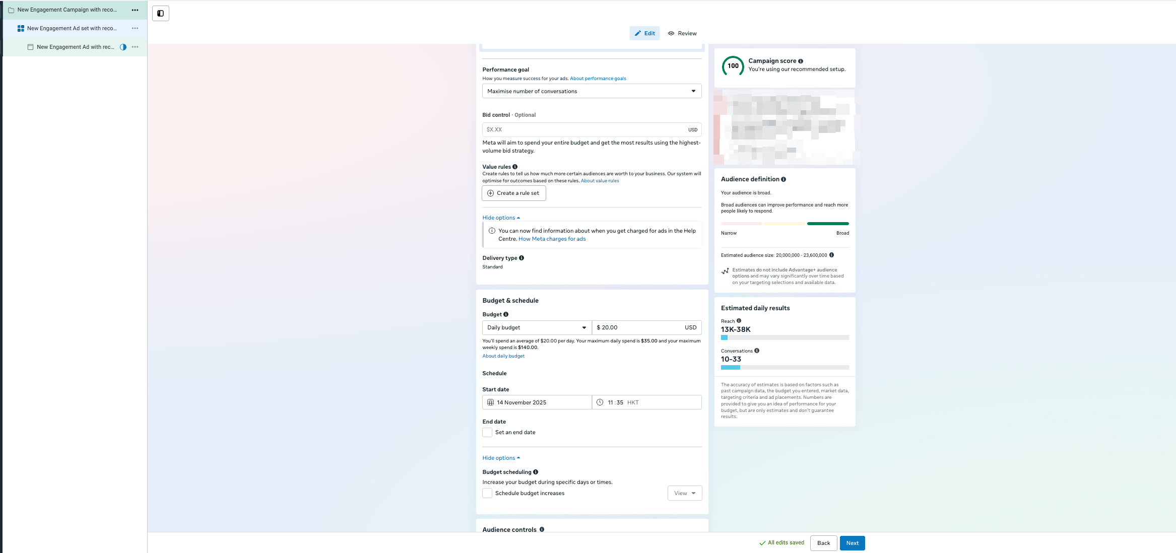 Review your campaign settings, including Budget Settings. You can learn more about campaign budgets here. When ready, click Next to configure your Ad Set.