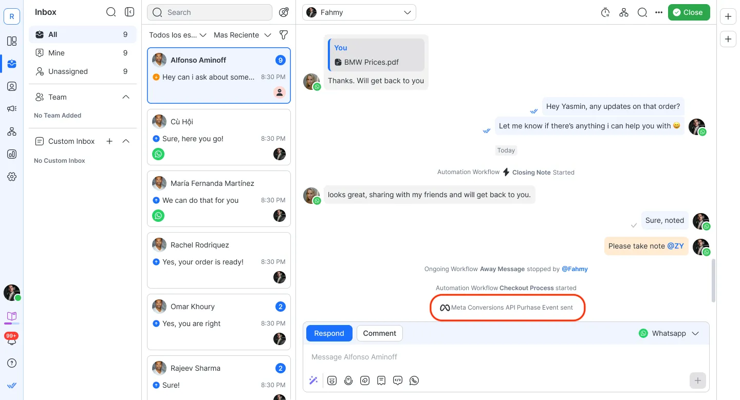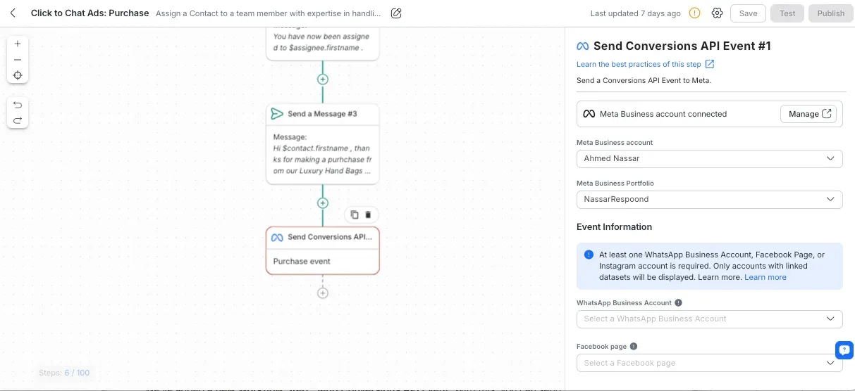 In the Workflows module, you can create automated Workflows that send conversion events to Meta. By adding the Send Conversions API Event workflow step, you can track conversions triggered by customer interactions on WhatsApp, Messenger, or Instagram.
