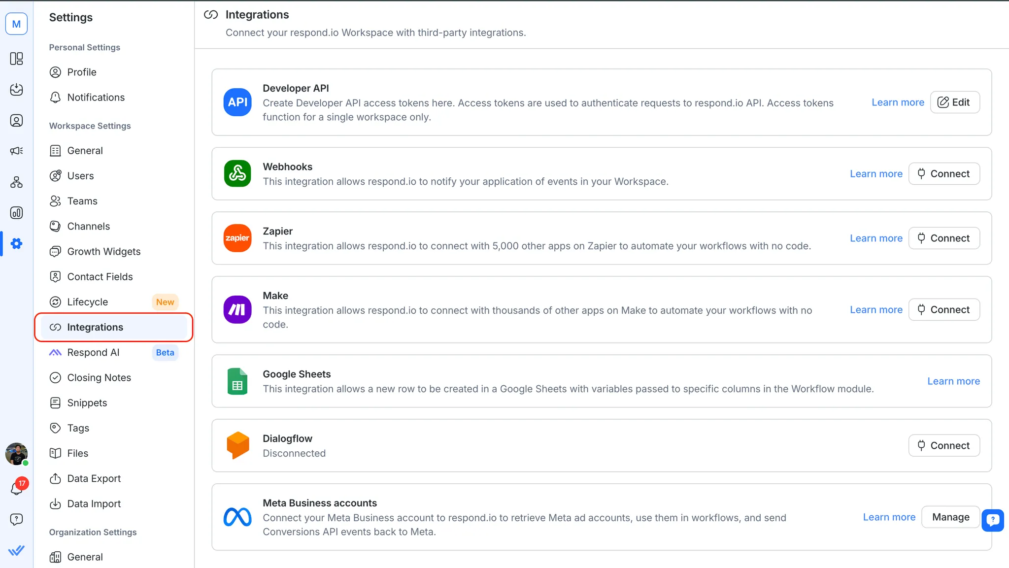 The Meta Business account integration with respond.io offers powerful tools like the Meta Conversions API and Meta click-to-chat ads to enhance your marketing efforts. The Meta Conversions API connects your marketing data directly to Meta, helping you optimize your ads, improve your ROI and track performance more accurately across WhatsApp, Messenger and Instagram.