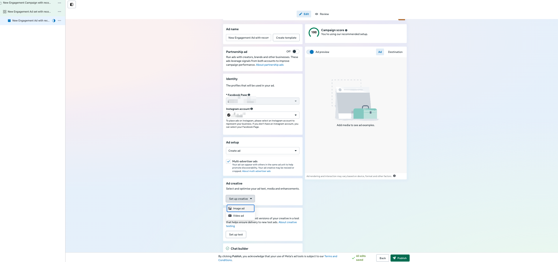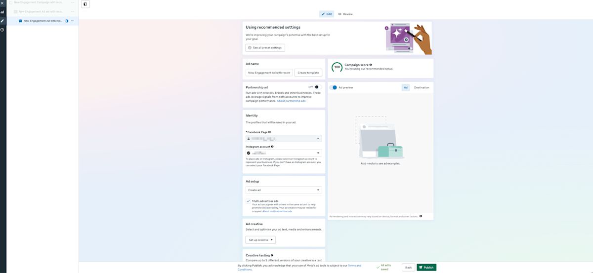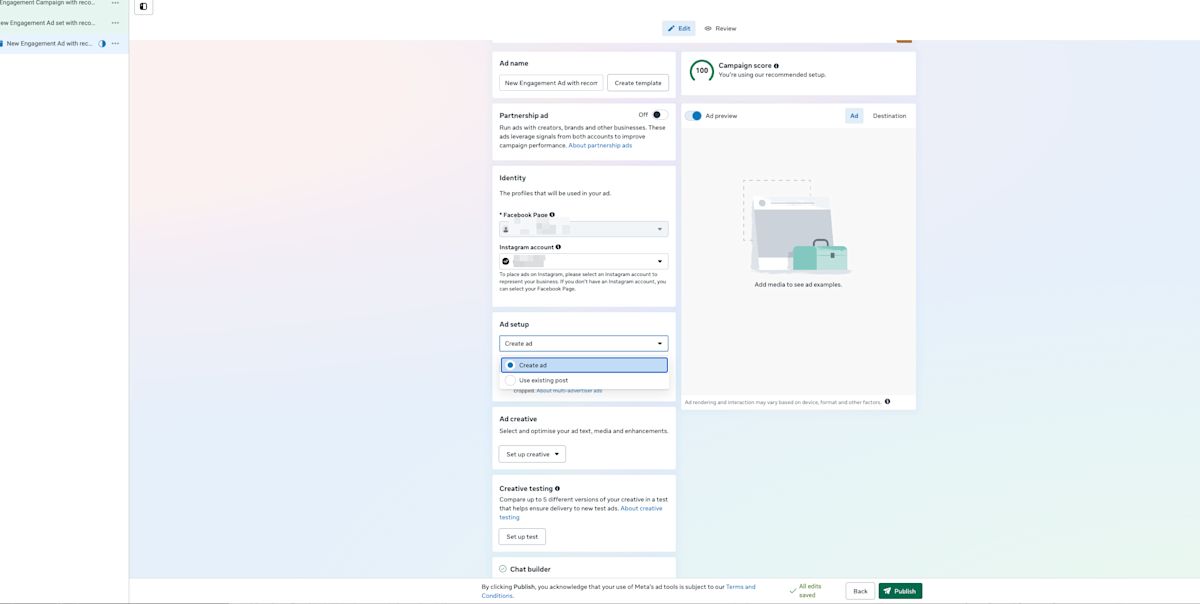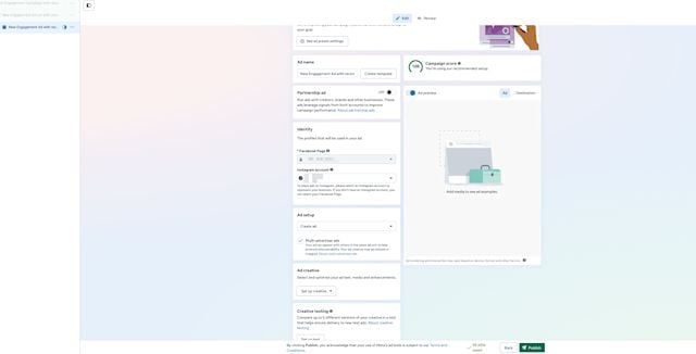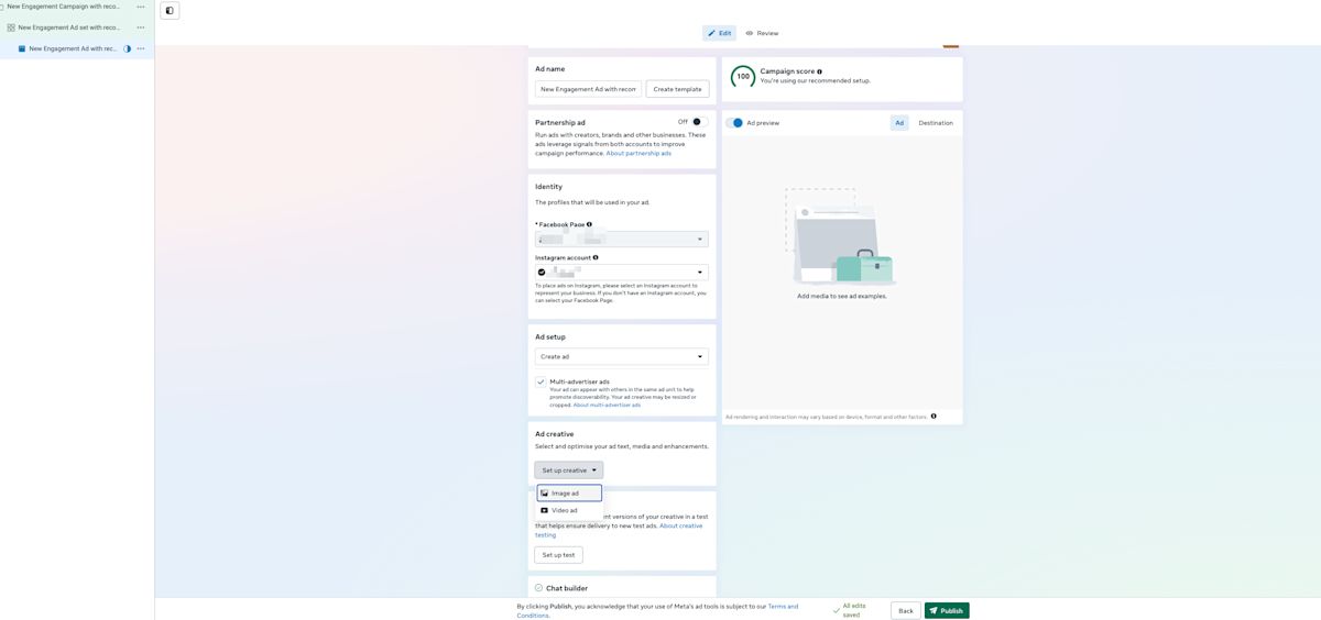 Under Identity, confirm the Facebook Page and/or Instagram account the ad will run under.