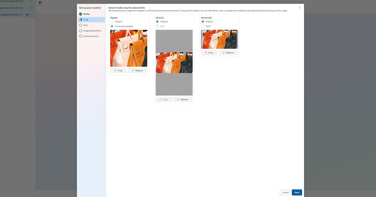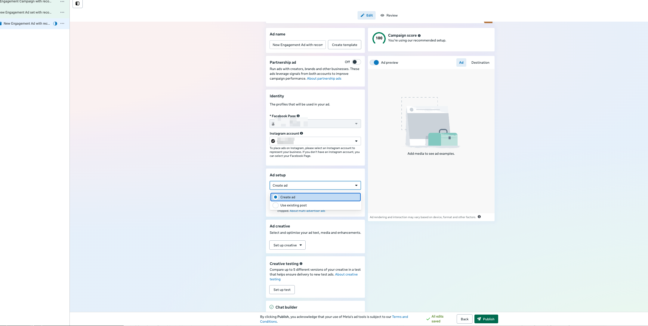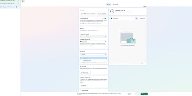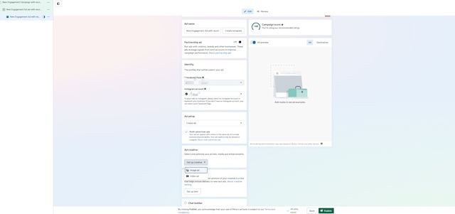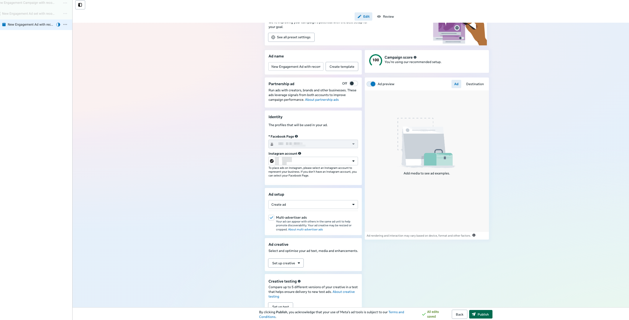 Under Identity, confirm the Facebook Page and/or Instagram account the ad will run under.