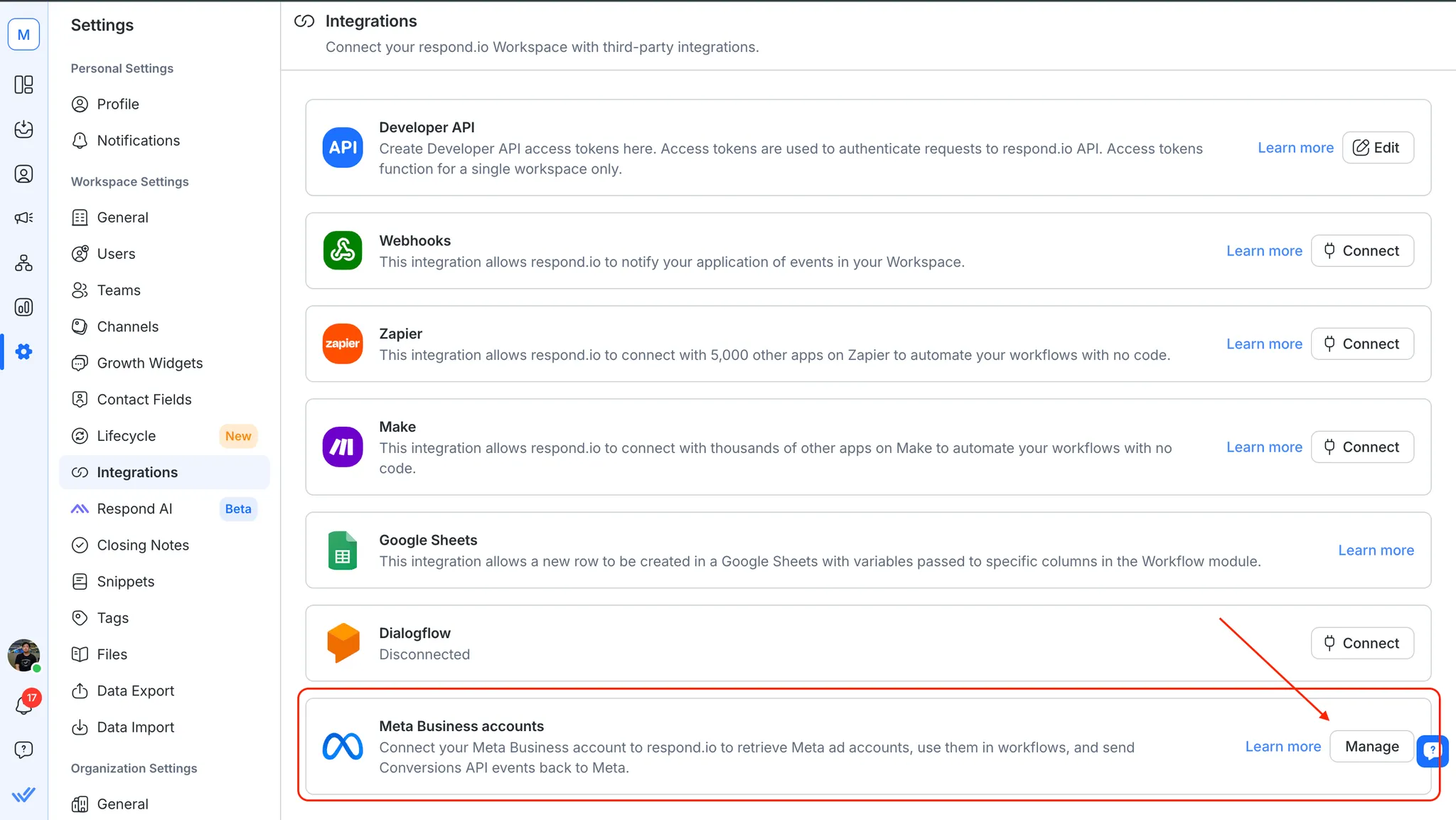 Congratulations! Youβve successfully connected your Meta Business Manager account to respond.io.