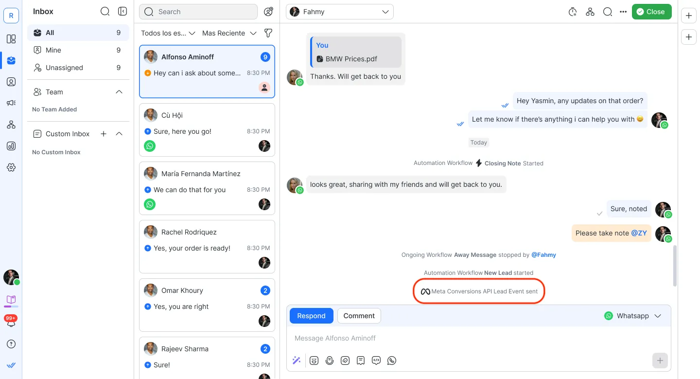 When a Meta Conversion API event is triggered, a new Contact event will appear in the Inbox module. This event allows you to track when a Lead or Purchase conversion is sent to Meta.