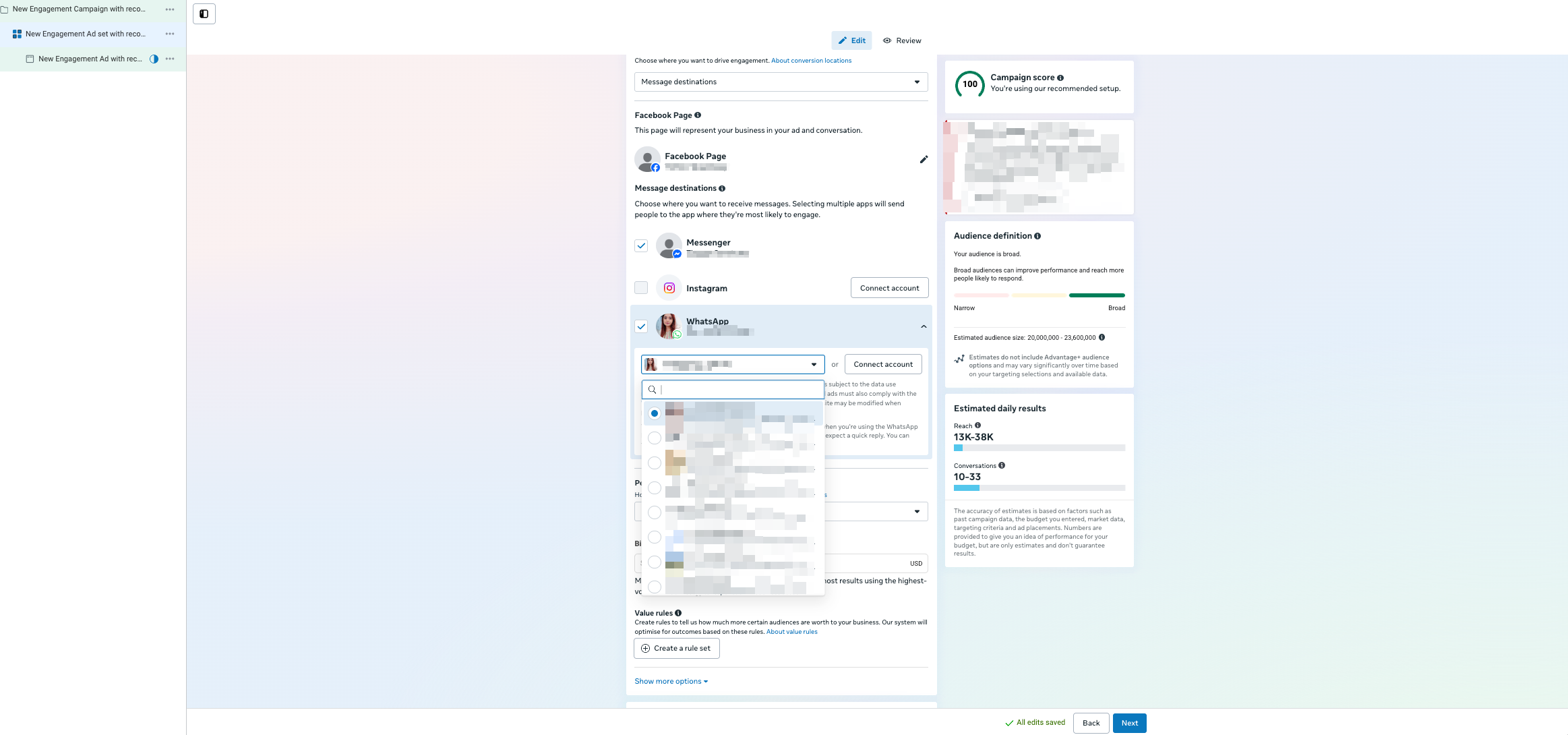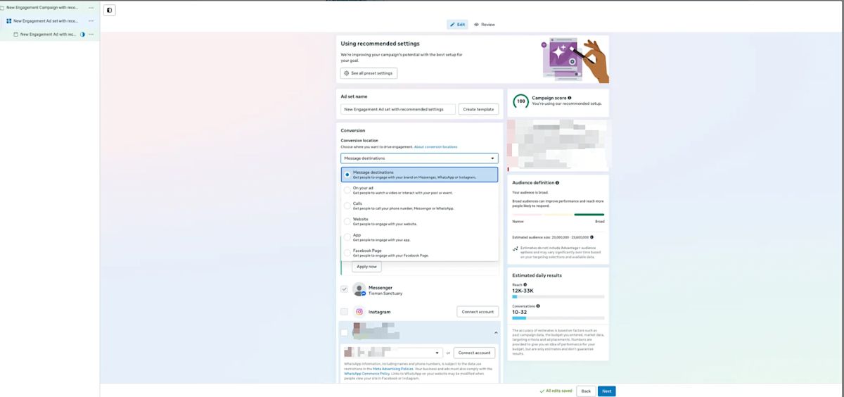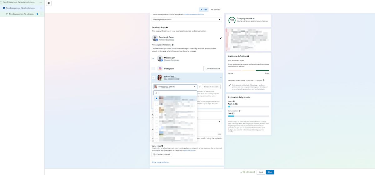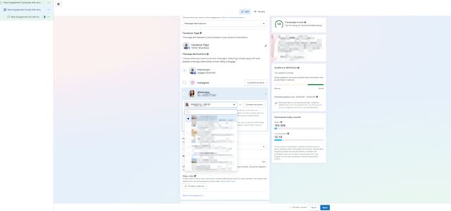 Select the Facebook Page for Messenger, and/or Instagram account for Instagram Direct Messages, and/or WhatsApp account for WhatsApp messaging used in this ads campaign.