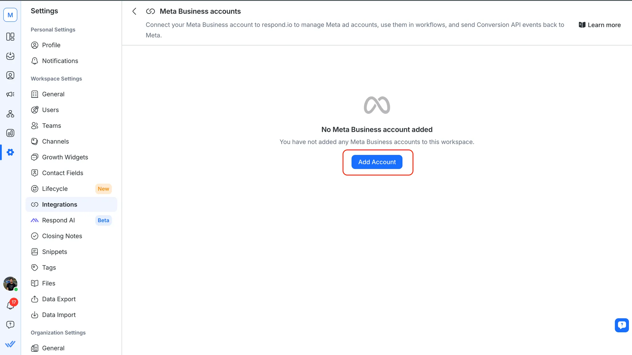 Additionally, Meta click-to-chat ads allow potential customers to start a conversation directly from ads on Meta platforms like Facebook and Instagram. With respond.io, you can seamlessly track engagement, leverage Workflows, and personalize interactions based on the customerβs journey from the moment they click on your ad.