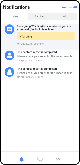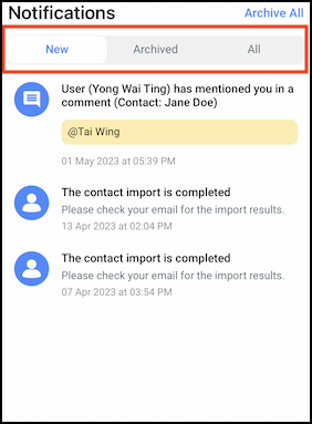 All - This tab lists all notifications regardless of archived or unarchived.