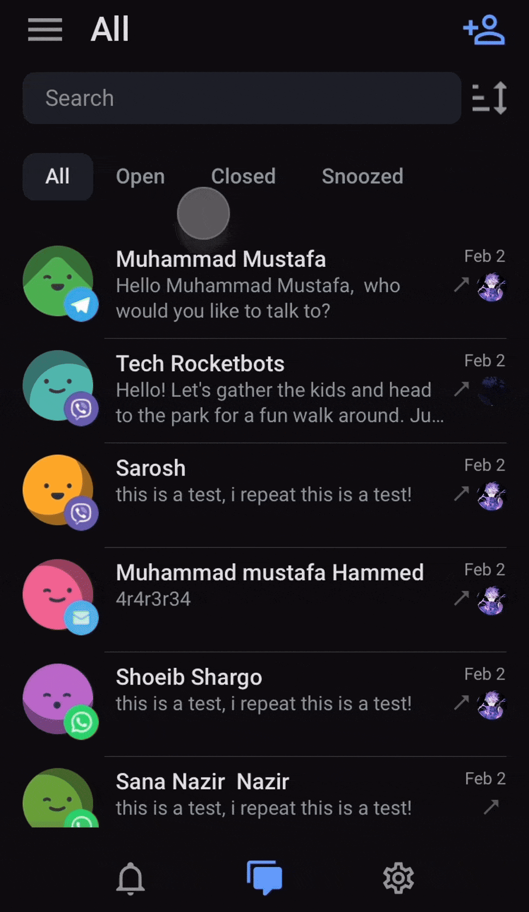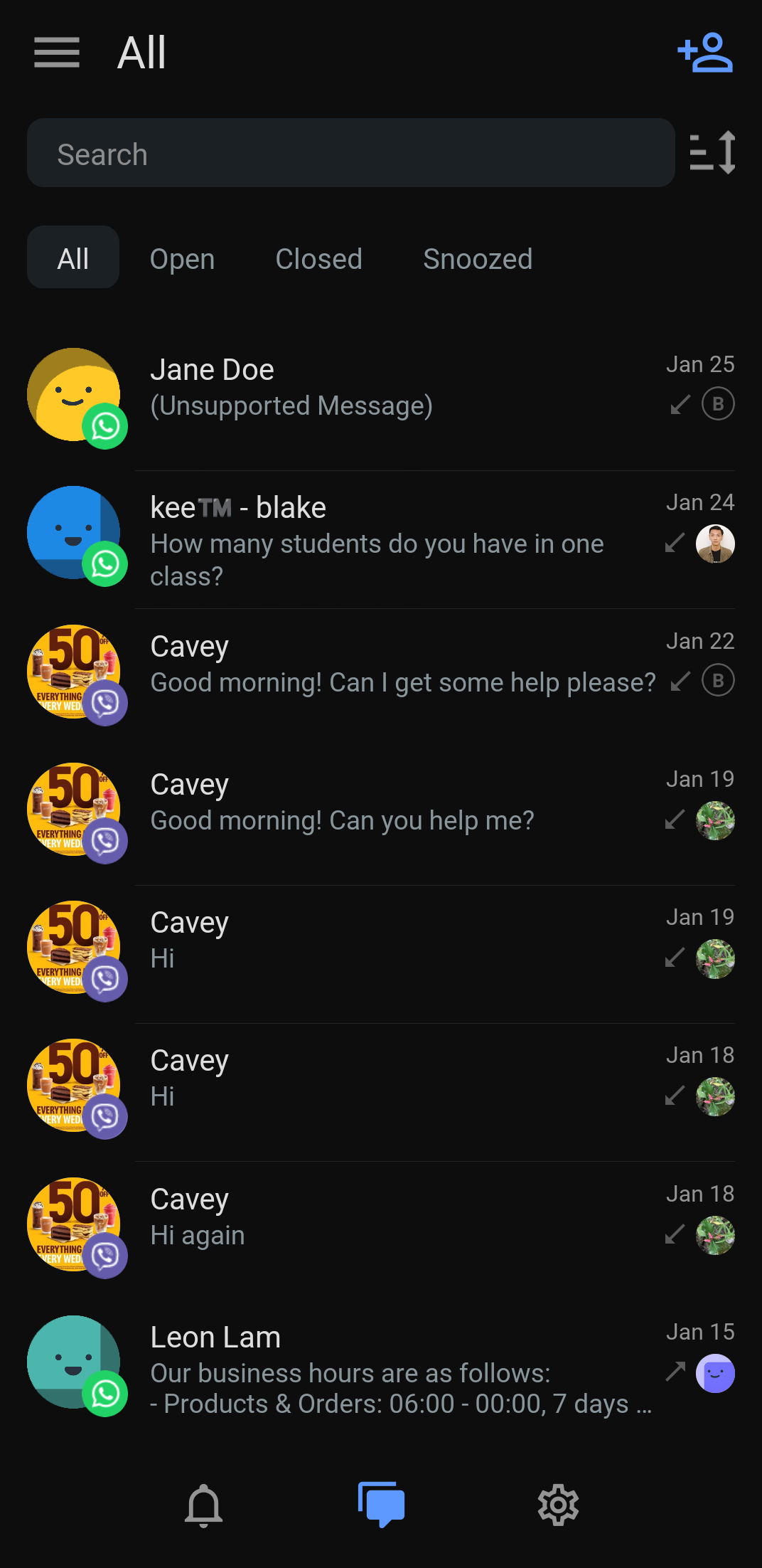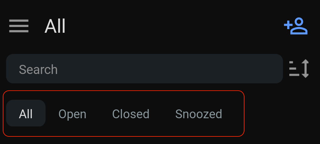 Longest Open / Closed / Snoozed - Depending on the tab filter, sort Contacts by the longest length of time the conversation has been opened, closed or snoozed (from longest to shortest duration).