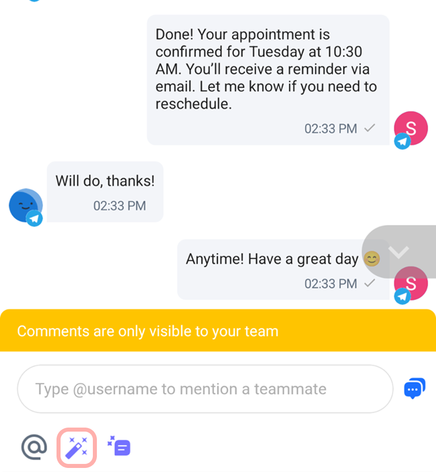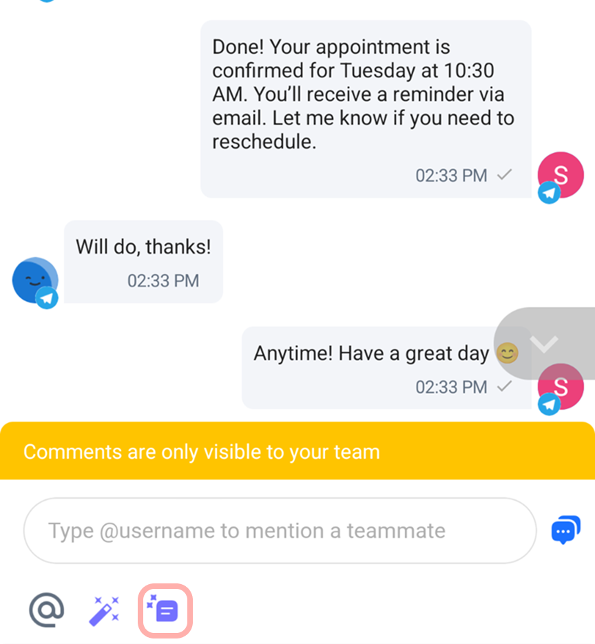Reply messages using AI prompts. Tap the icon to display different type of prompts you can use.