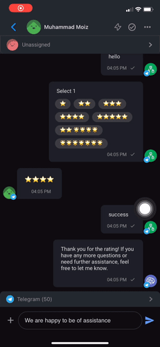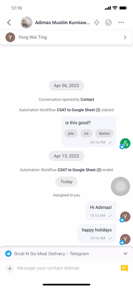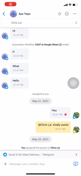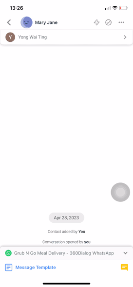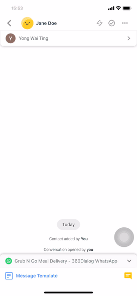 From the conversation history, tap the section below the Contact’s name, or tap the three-dot action menu at the top right of the screen and tap Assign User > select the user to whom you want to assign > tap Done.