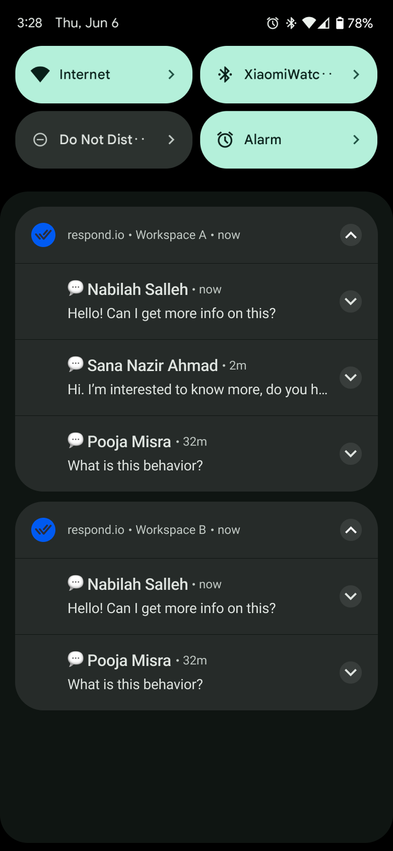 Keep your notifications tidy with automatic grouping by Contact (with Workspace name displayed). Tap a group to expand and see all related notifications or collapse for a cleaner view.