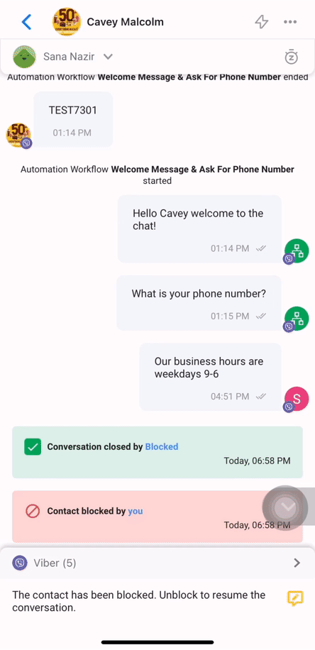 If Contacts have been mistakenly blocked, you can reverse the action and resume conversation with them. From the conversation history, tap the three-dot action menu at the top right of the screen > tap Unblock Contact > tap Unblock.