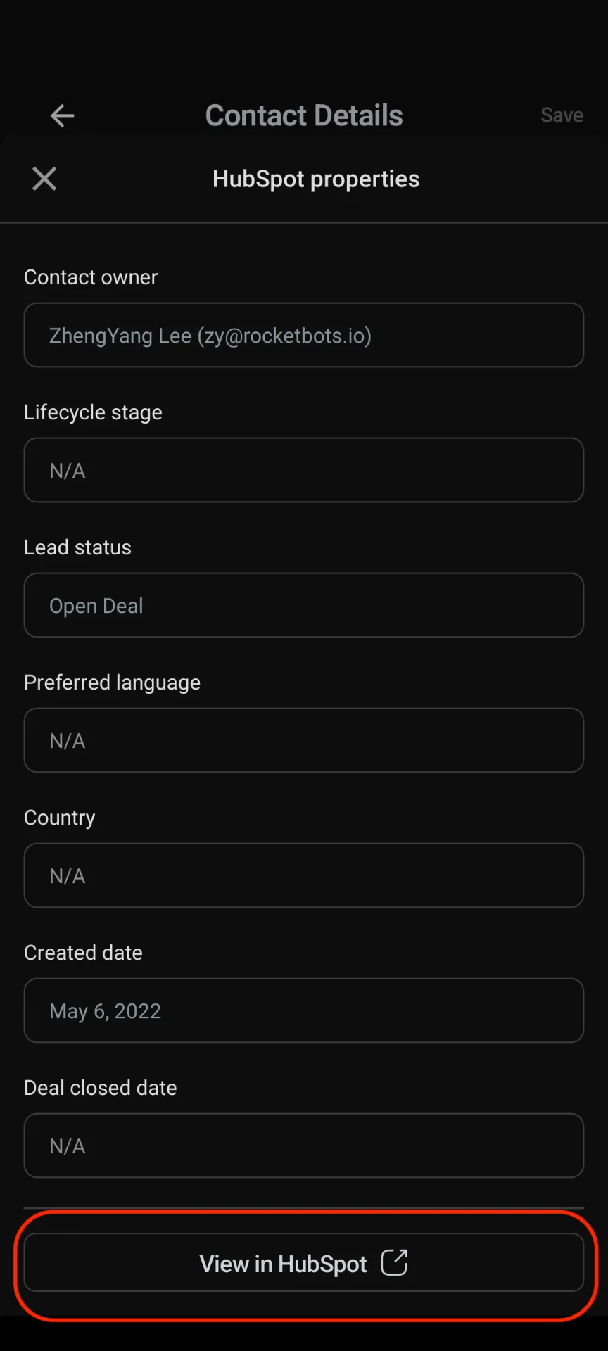 Once you’ve connected your HubSpot account to your workspace, you can also view HubSpot contact properties in the mobile app.