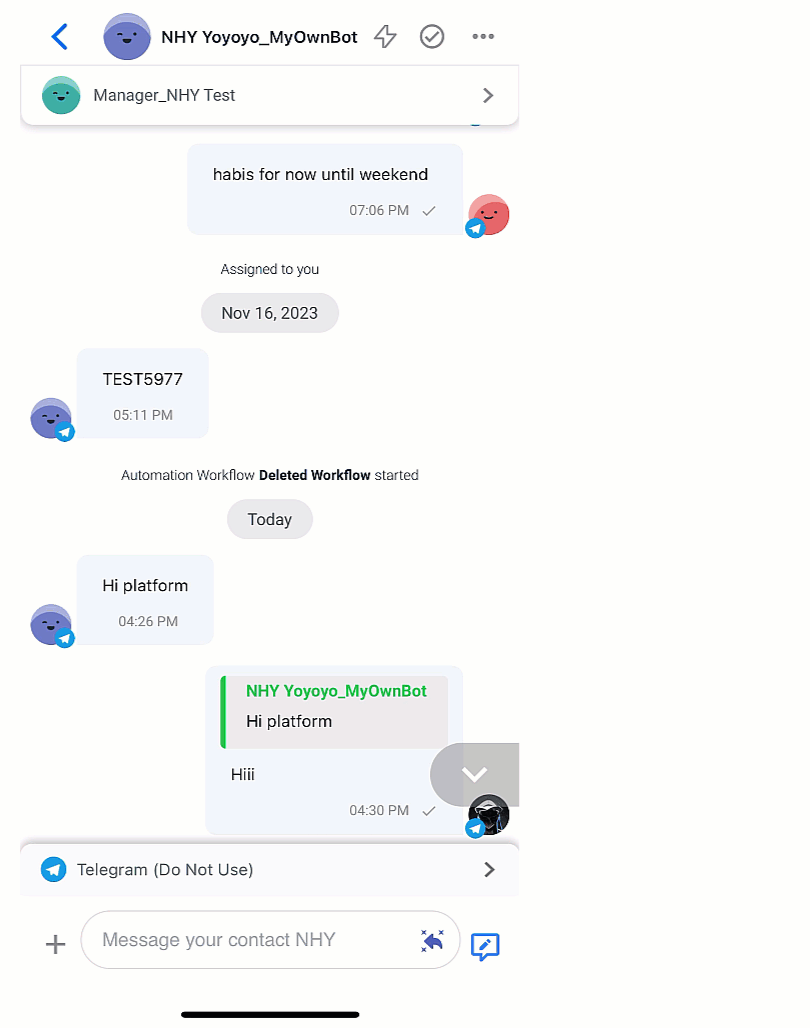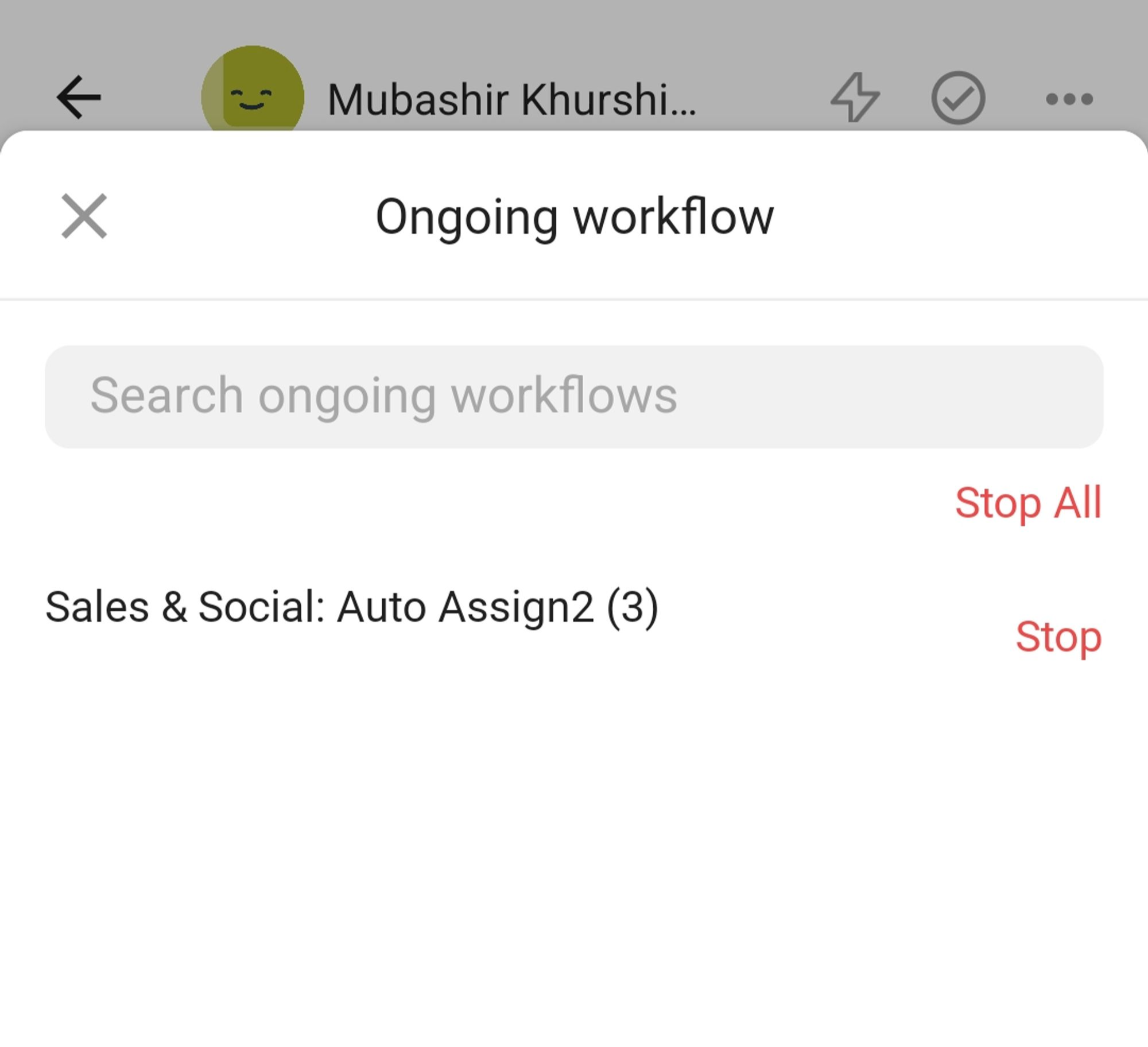 You can view and stop any ongoing Workflows for a Contact with this option. To view the list of ongoing Workflows for the Contact, simply go to the conversation history and tap the three-dot action menu at the top right of the screen > tap Ongoing Workflows.