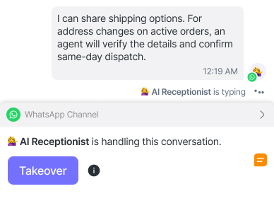 You can now manually take over a conversation that is currently being handled by your AI Agent. This feature ensures that when the AI provides an incorrect answer, can’t address the customer’s query, or is taking too long to respond, a human agent can immediately step in.