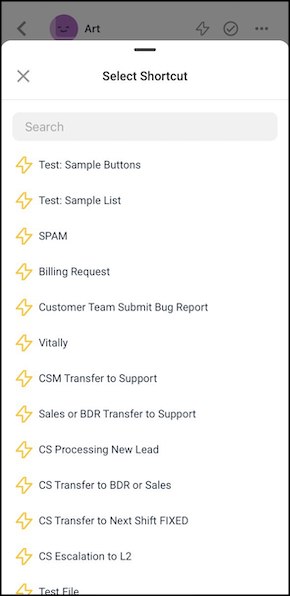 To initiate a Workflow, go to the conversation history and tap the lightning icon at the top right of the screen, or tap the three-dot action menu at the top left of the screen and tap Select Shortcut > tap the shortcut.