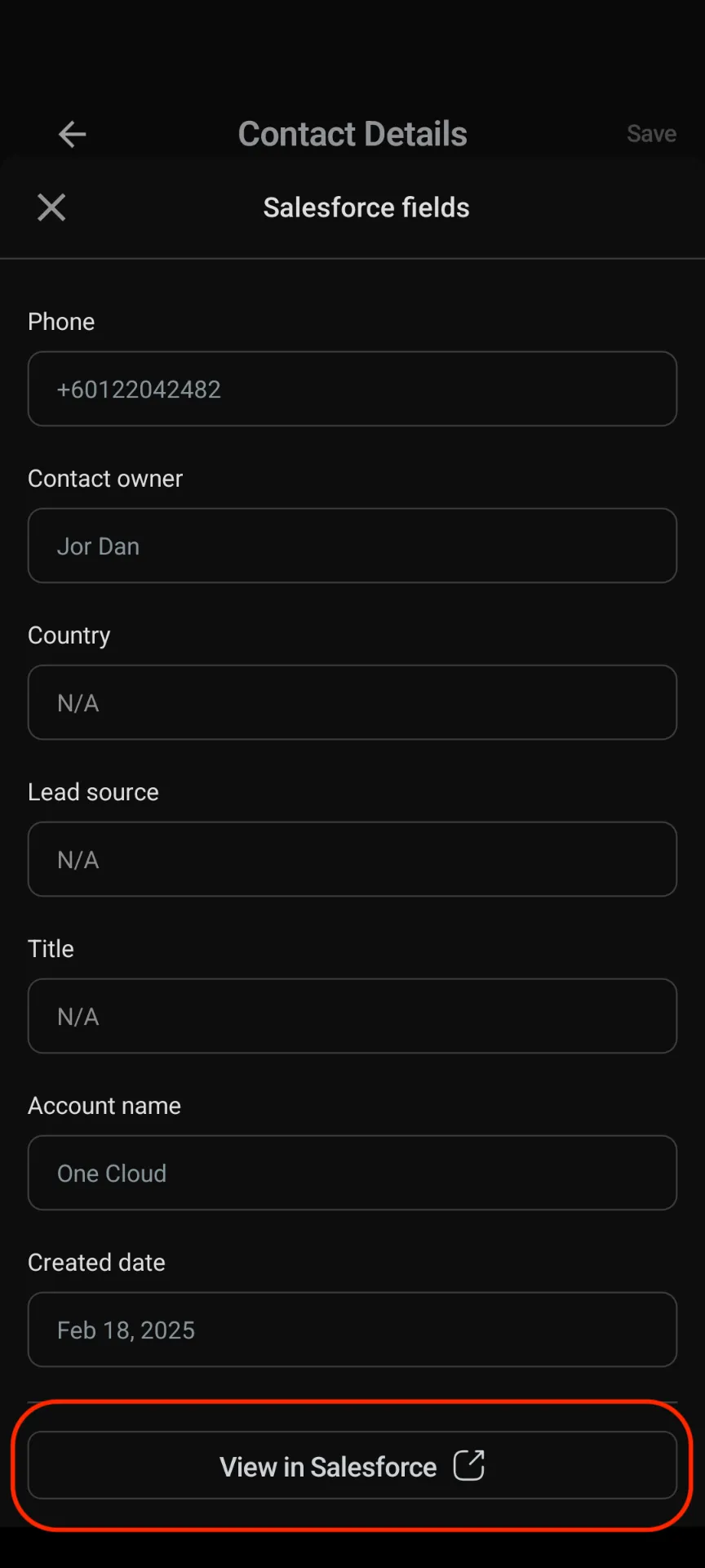 Once you’ve connected your Salesforce account to your workspace, you can also view Salesforce contact fields in the mobile app.