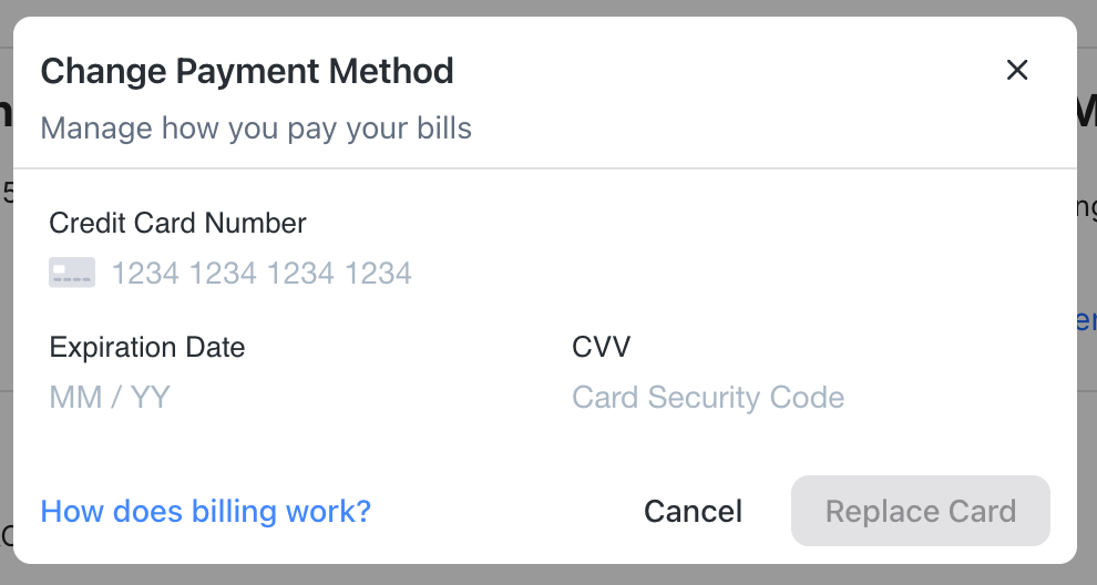 If you would like to change your payment method, please click the Change payment method to fill in your new payment details, and click Replace card.