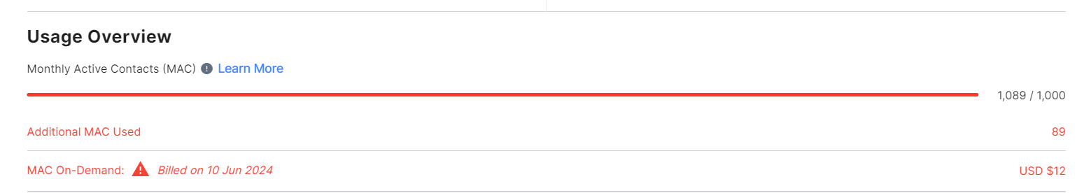 Your monthly MAC On-Demand usage is also shown here. MAC On-Demand is a pay-per-block option that allows you to continue messaging and calling Contacts even when you reach your plan limit, without the need to upgrade your plan.