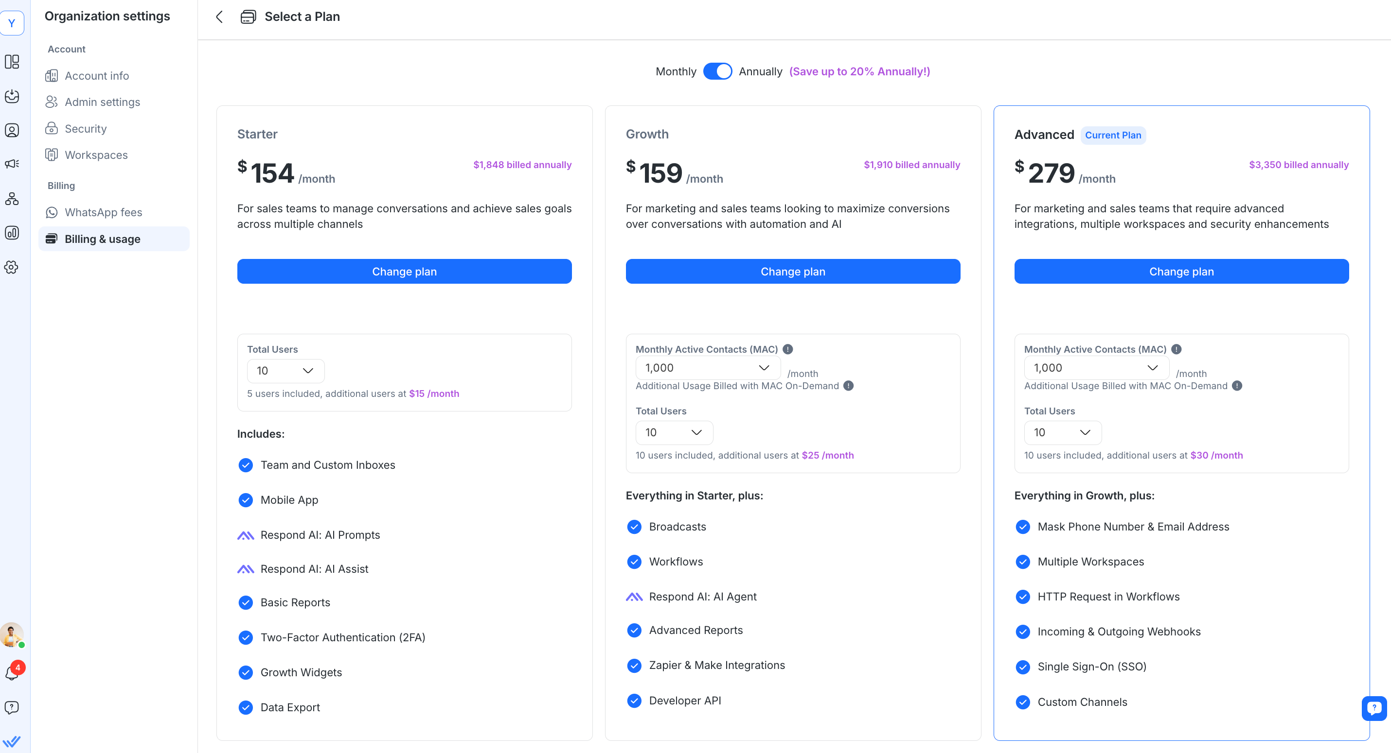 If you would like to change your subscription plan, click Change plan. You will be directed to the pricing page to select your desired plan.