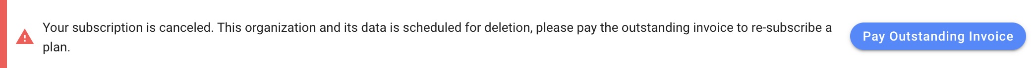 When an organization initiates a cancellation, the account will be canceled at the end of the current billing cycle. Accounts with an overdue invoice that is not resolved by the end of the billing cycle will be Frozen state until payment is made. If payment is not made before the end of the next billing cycle the account status will be changed to Canceled.