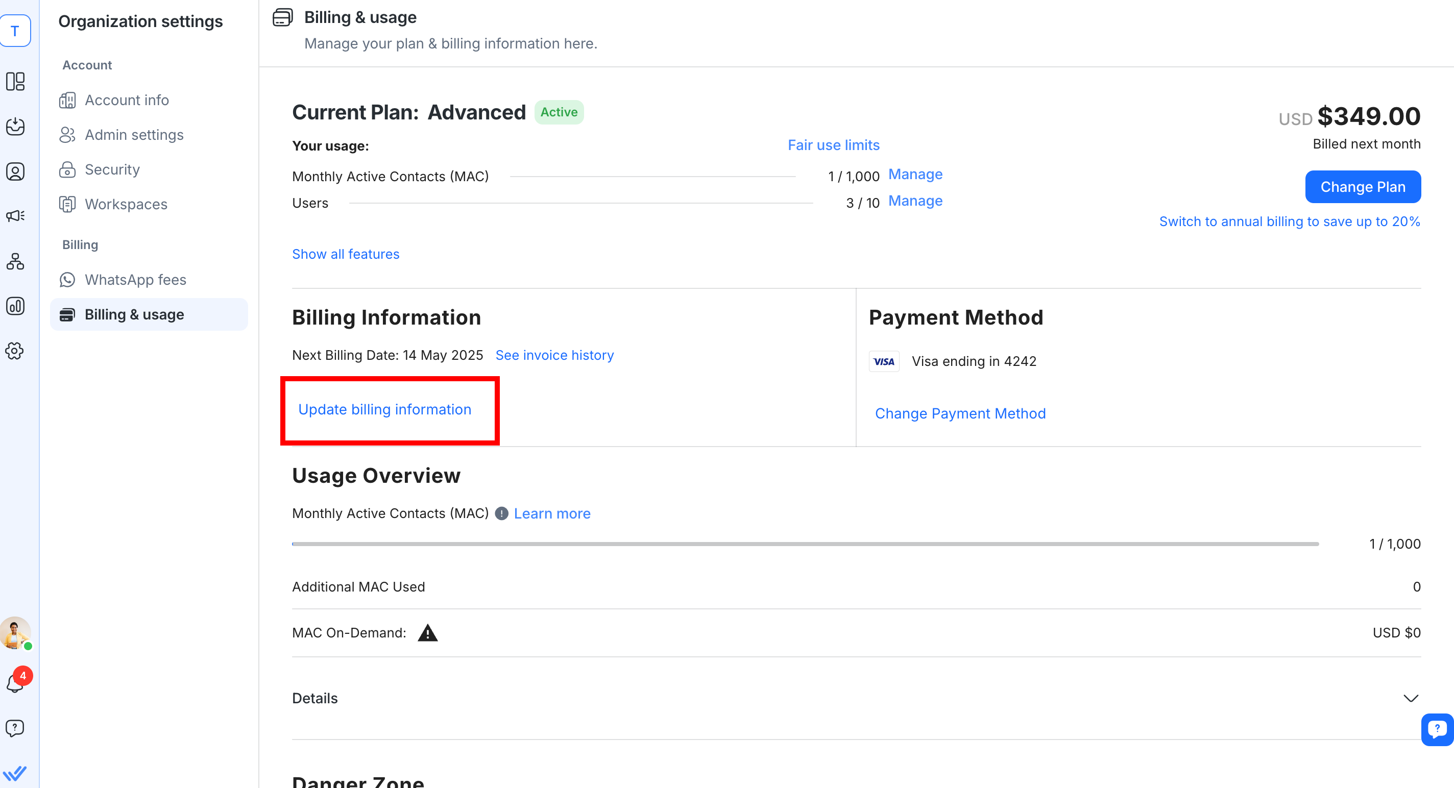 To update your billing address and details, an Organization Admin or Billing Admin user can change the information from the Billing & Usage page by clicking on Update billing information.