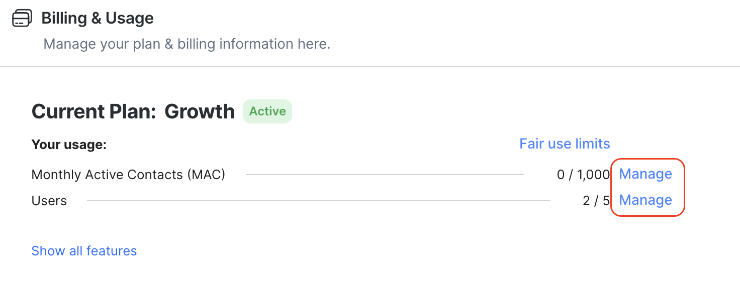 Organizations subscribed to the new pricing plan can change the number of MAC and Users via the respective Manage links. These Manage links can be found in the Billing & Usage section of Organization Settings.