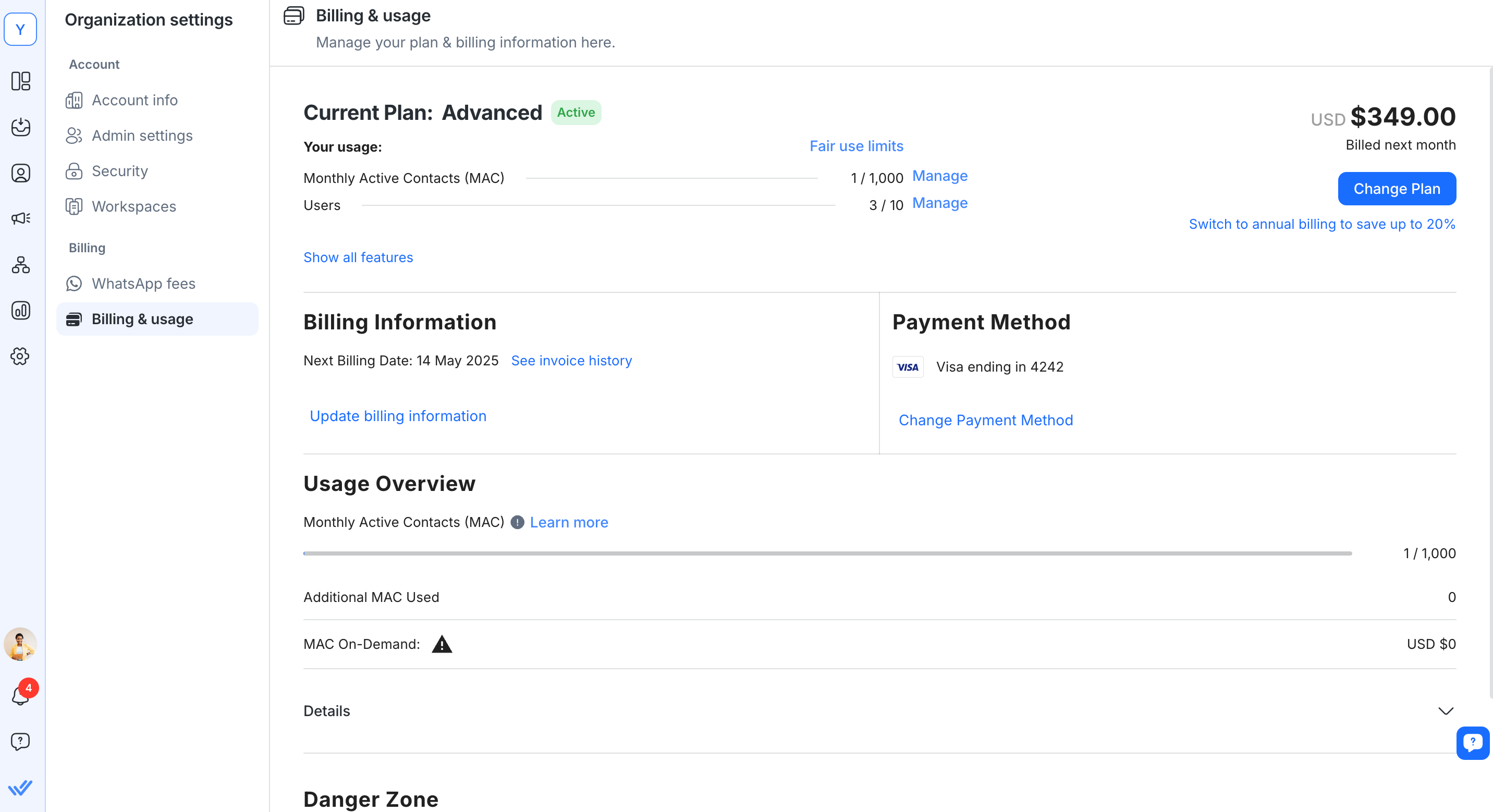 In this module, you can make changes to your current subscription plan, update your billing information and payment method, view your invoice history and keep track of your subscription plan usage.