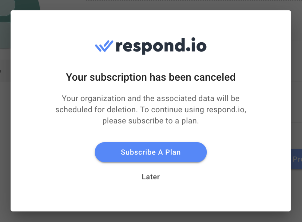 Your subscription status changes to FROZEN if you have an overdue invoice that exceeds the 5 days grace period. In the FROZEN status, access to the respond.io platform will be blocked until you settle all your overdue invoices. Although incoming messages will still be received and stored in this status, Workflows cannot be triggered and outgoing messages cannot be sent. If the overdue invoice is not paid by the end of your billing cycle, your subscription will be canceled.