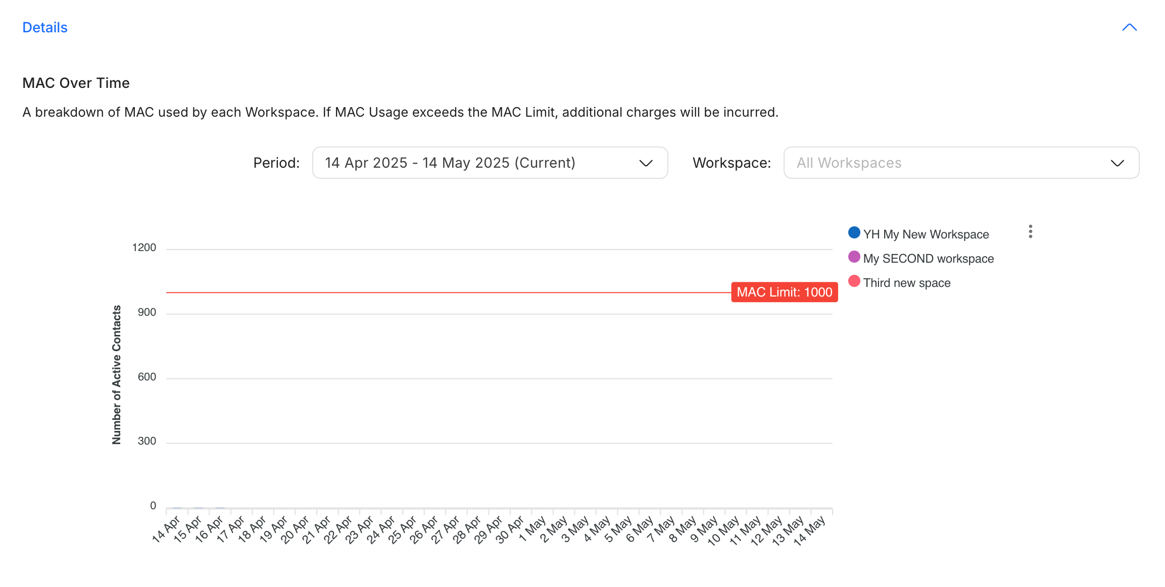 Upon clicking on Details, you will be able to see the breakdown of MACs (Contacts who have messaged or been messaged, or made/received calls) used by each Workspace in your organization on a monthly basis.