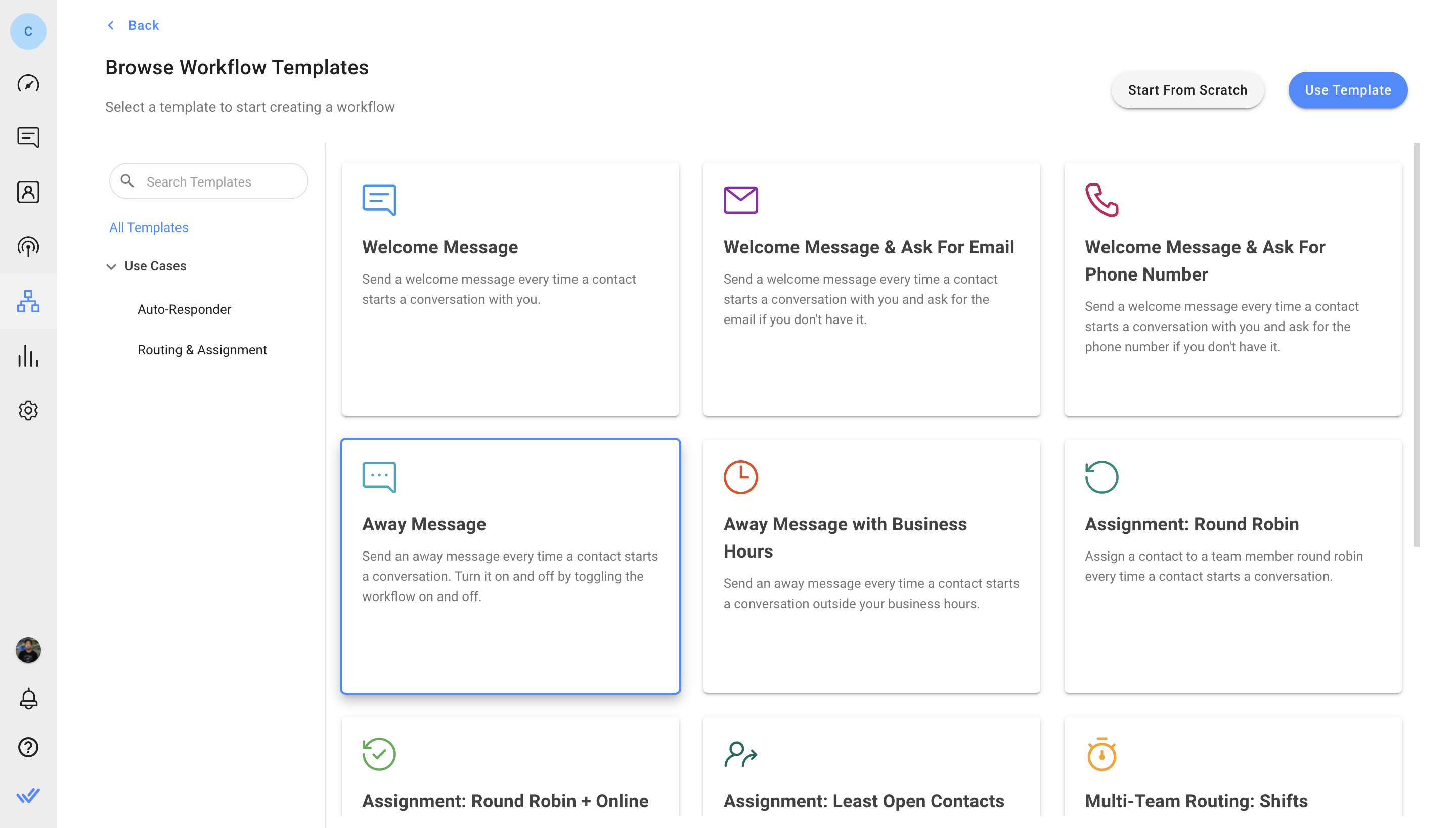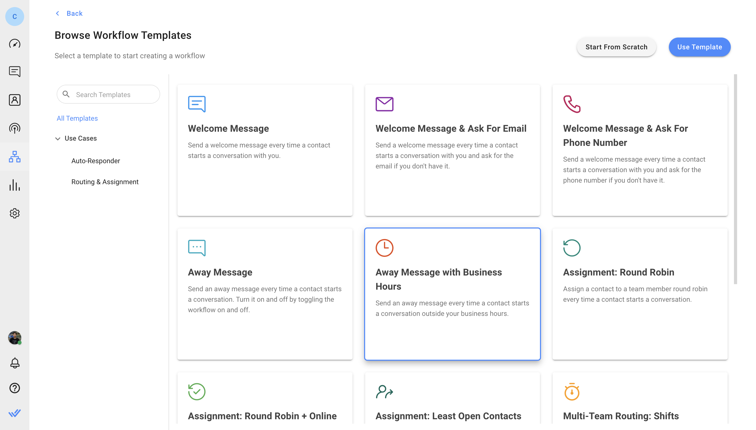 On the respond.io platform menu, click Workflows > + Add Workflow. Then, Click Away Message with Business Hours > Use Template.