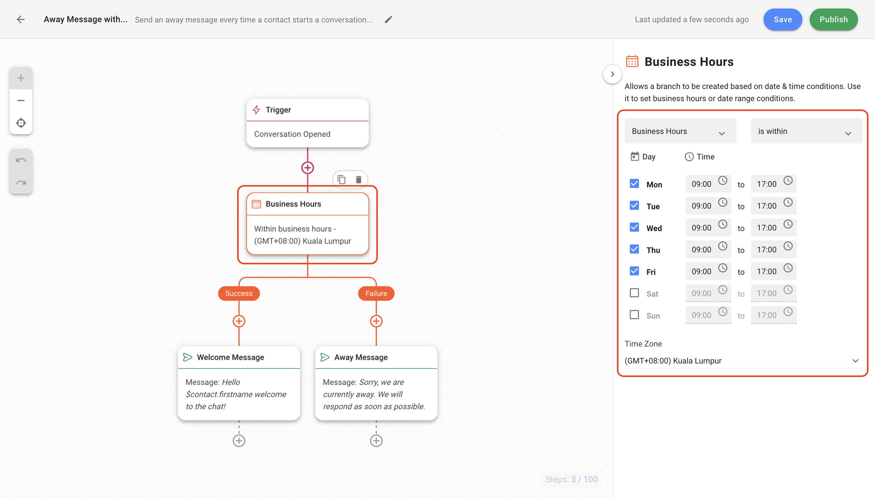 Set up the Workflow templates to send a welcome or away message based on business hours