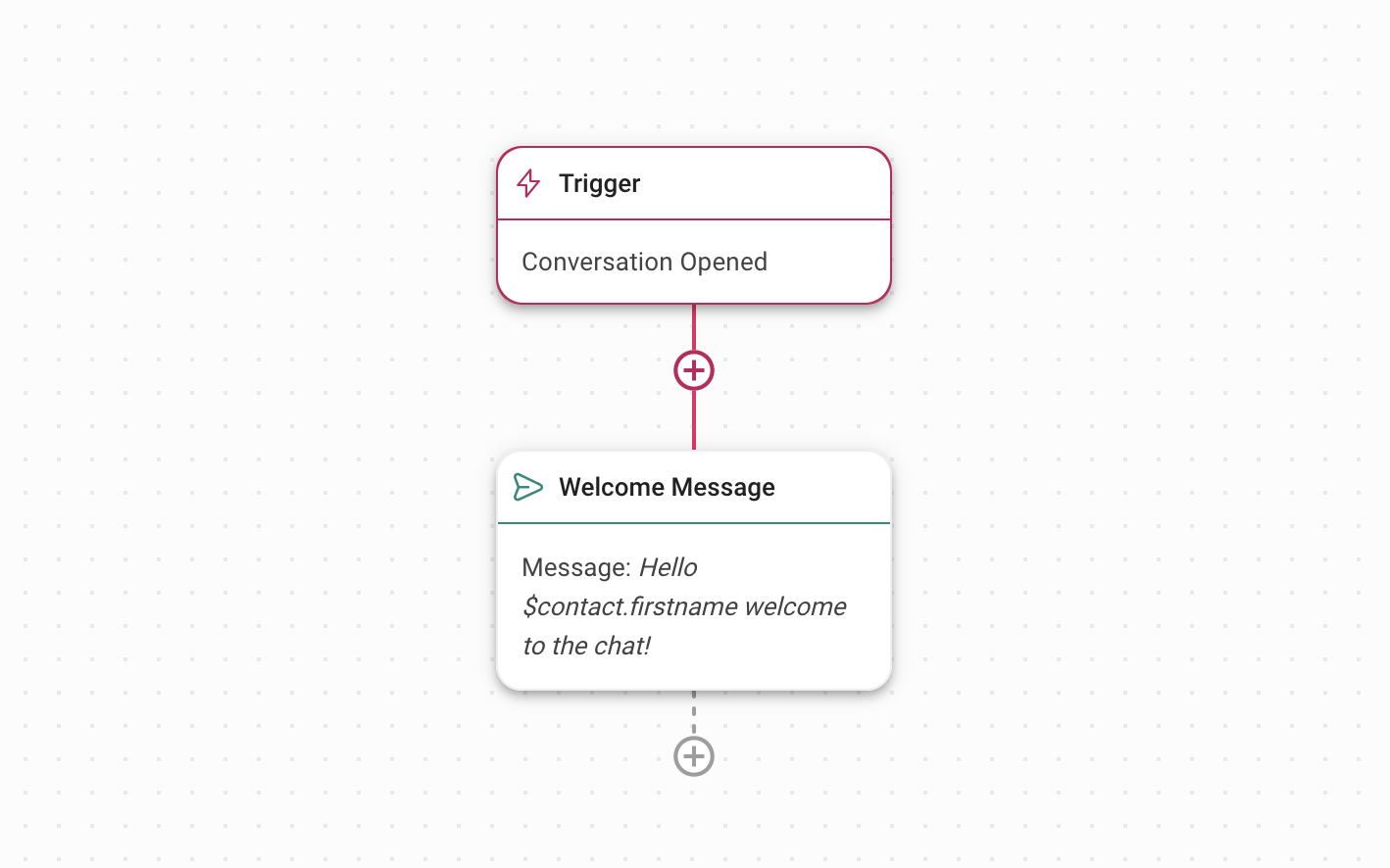 The Workflow template is set up with a Trigger and the Send a Message step. This sends an automated reply to Contacts when a conversation is opened.