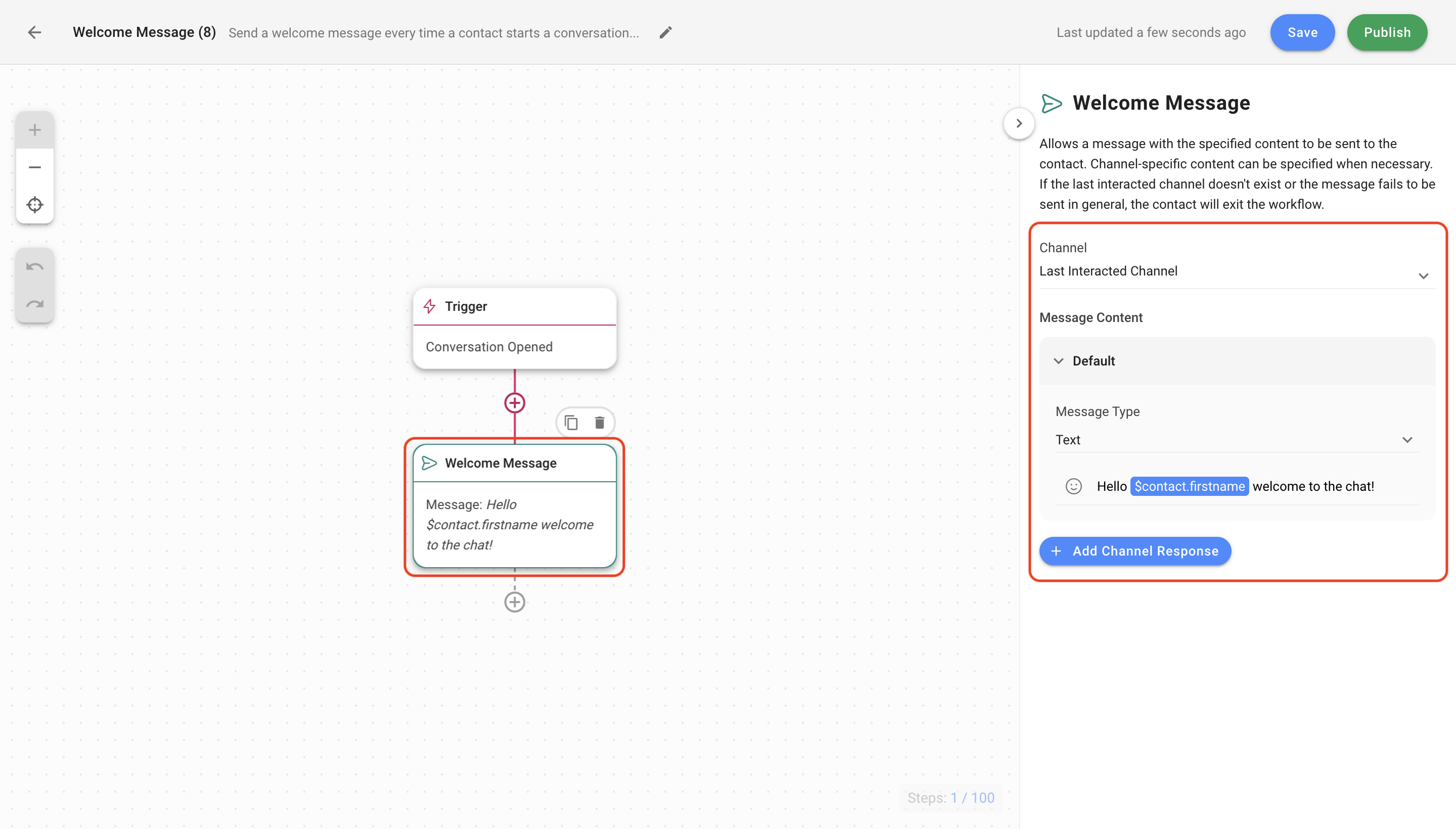 Click the Welcome Message step to edit the Message Content. The Message Type should remain as Text. Finally, click Save and Publish to activate the Workflow.