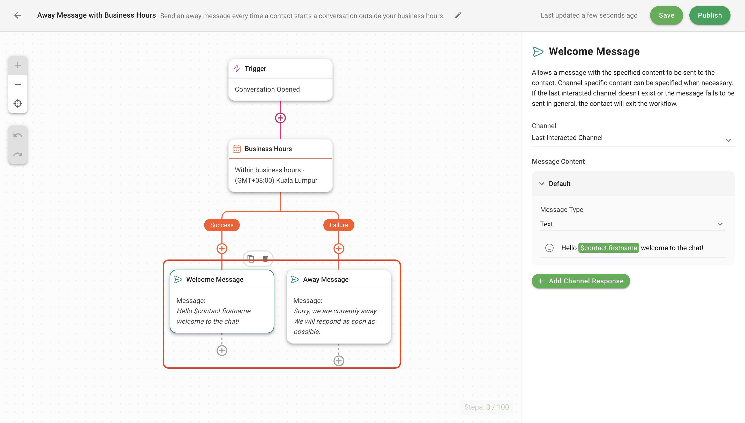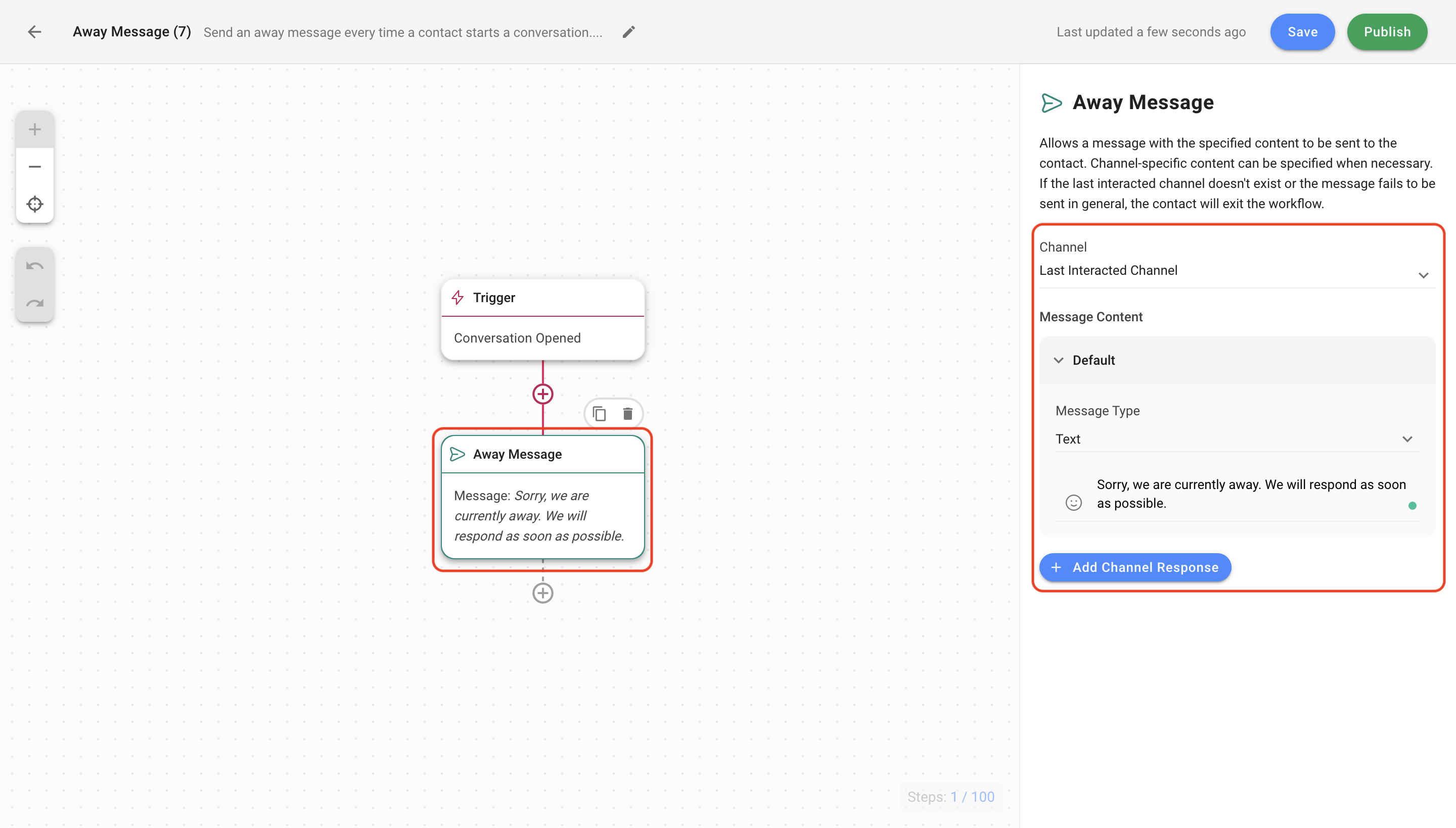 Click the Welcome Message or Away Message step to edit the Message Content. The Message Type should remain as Text. Finally, click Save and Publish to activate the Workflow.