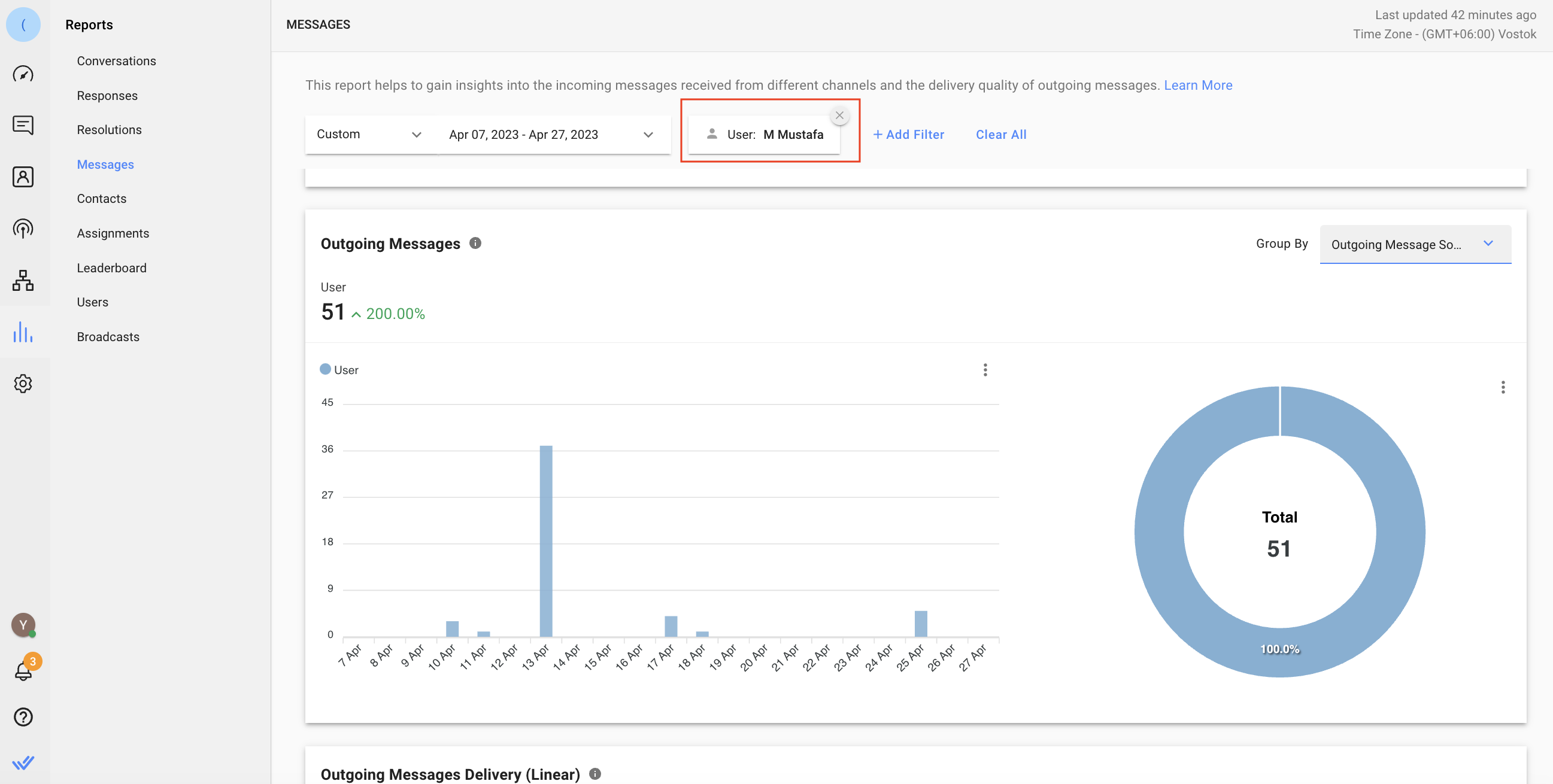 Use the Outgoing Messages by Source chart to identify anomalies for outbound conversations in your team. Support agents usually do not message the customer first unless it’s necessary for follow-up purposes or used by dedicated support agents to stay in touch with VIP customers. For example, if a support agent is found to have a high open conversation rate, managers may want to check in with the agent for an explanation.
