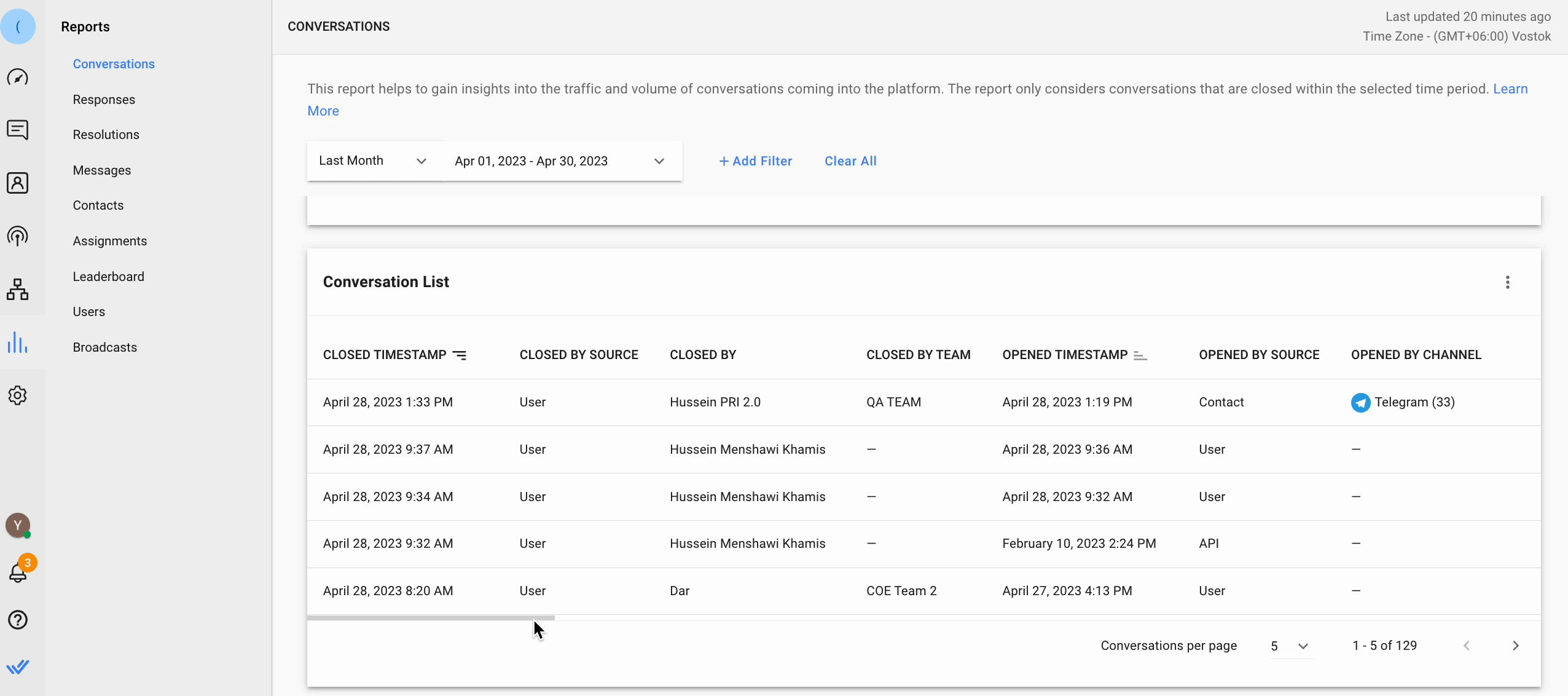 Support managers can use this list to evaluate the quality of conversations with customers by analyzing the columns available here. For example, if a conversation has a long Resolution Time with high number of Messages, you'll want to investigate if this was an uncommon issue or if the agent requires more training on an existing issue.