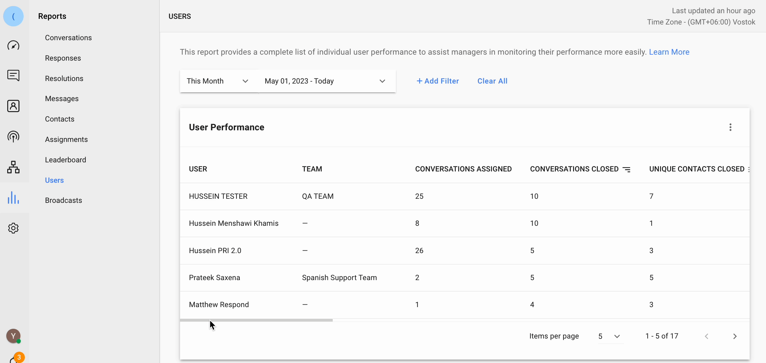 Use the User Performance table to view detailed performance reports on each agent. Here, you can compare agents' workload and set a benchmark for performance goals based on the average statistics. All metrics in this list are based on conversations closed by the agent.